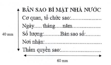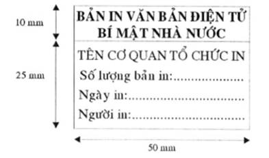 Mẫu dấu “BẢN IN VĂN BẢN ĐIỆN TỬ BÍ MẬT NHÀ NƯỚC”: Hình chữ nhật, kích thước 50 mm x 35 mm, phía trên là hàng chữ “BẢN IN VĂN BẢN ĐIỆN TỬ BÍ MẬT NHÀ NƯỚC”, trình bày bằng chữ in hoa, cỡ chữ 11, kiểu chữ đứng, đậm; phía dưới là hàng chữ “TÊN CƠ QUAN TỔ CHỨC IN” trình bày bằng chữ in hoa, cỡ chữ 11, hàng chữ “Số lượng bản in, Ngày in, Người in” trình bày bằng chữ thường, cỡ chữ 11. Kiểu chữ của các hàng chữ trong dấu “BẢN IN VĂN BẢN ĐIỆN TỬ BÍ MẬT NHÀ NƯỚC” là kiểu chữ Times new roman.