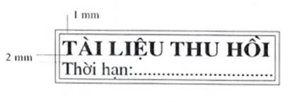 Mẫu dấu “TÀI LIỆU THU HỒI”: Hình chữ nhật, kích thước 55 mm x 13 mm có hai đường viền xung quanh, khoảng cách giữa hai đường viền là 01 mm; hàng thứ nhất là dòng chữ “TÀI LIỆU THU HỒI” được trình bày bằng chữ in hoa, cỡ chữ 14, kiểu chữ Times New Roman, đứng, đậm; hàng thứ hai là dòng chữ “Thời hạn” ở đầu hàng và các dấu chấm cho đến hết, trình bày bằng chữ thường, cỡ chữ 13, kiểu chữ Times New Roman; khoảng cách giữa hàng chữ thứ nhất và hàng chữ thứ hai là 02 mm.