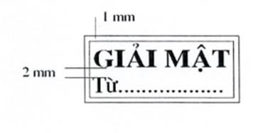 Mẫu dấu “GIẢI MẬT”: Hình chữ nhật, kích thước 30mm x 13mm, có hai đường viền xung quanh, khoảng cách giữa hai đường viền là 01 mm; hàng thứ nhất là dòng chữ “GIẢI MẬT”, trình bày bằng chữ in hoa, cỡ chữ 14, kiểu chữ Times new roman, đứng, đậm; hàng thứ hai là chữ “Từ:….” ở đầu hàng và các dấu chấm cho đến hết, trình bày bằng chữ thường, cỡ chữ 13, kiểu chữ Times new roman; khoảng cách giữa hàng chữ thứ nhất và hàng chữ thứ hai là 02 mm. Sau khi đóng dấu “GIẢI MẬT” ở dòng “Từ:….” phải ghi rõ thời gian giải mật bắt đầu từ ngày, tháng, năm lãnh đạo có thẩm quyền ký quyết định giải mật.