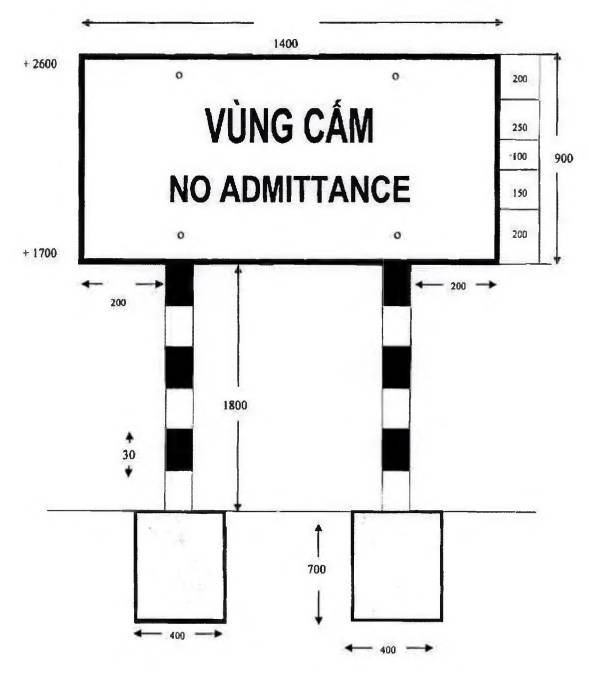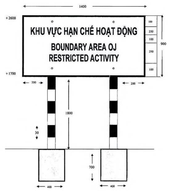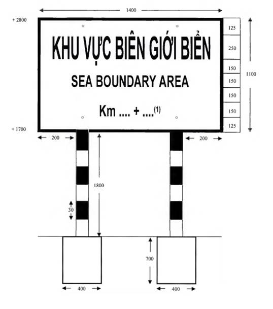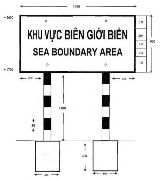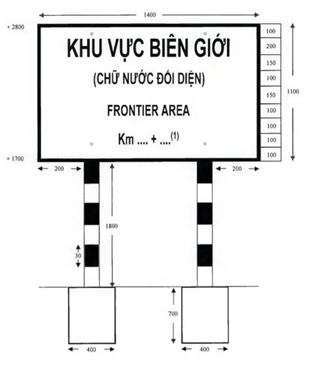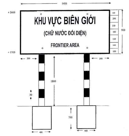 “1. Biển báo “khu vực biên giới”, “vành đai biên giới”, “vùng cấm” theo mẫu thống nhất bằng tôn, dày 1,5mm, cột bằng thép ống đường kính 100mm, dày 2mm; mặt biển, chữ trên biển báo sơn phản quang; nền biển sơn màu xanh, chữ trên biển sơn màu trắng, cột sơn phản quang, màu trắng, đỏ; chữ trên biển báo ghi thành ba dòng: Dòng thứ nhất chữ bằng tiếng Việt Nam, dòng thứ hai chữ bằng tiếng của nước đối diện, dòng thứ ba chữ bằng tiếng Anh. Kích thước biển báo, chữ viết trên biển báo theo mẫu từ Mẫu số 01(a,b) đến Mẫu số 12 tại Phụ lục I kèm theo Thông tư này.”.