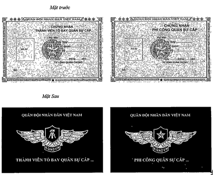 Từ trên xuống bên trái là ảnh của người được cấp Giấy chứng nhận, bên phải là các dòng chữ: Họ tên; Loại máy bay; Số hiệu sĩ quan; Đạt trình độ phi công (cơ giới trên không; trinh sát tuần thám trên không;....) quân sự cấp 1 (cấp 2, cấp 3), (cỡ chữ 8, font chữ Times New Roman); …, ngày... tháng... năm... (cỡ chữ 6 nghiêng, font chữ Times New Roman); người có thẩm quyền cấp giấy ký tên và đóng dấu (cỡ chữ 8 đứng đậm, font chữ Times New Roman);