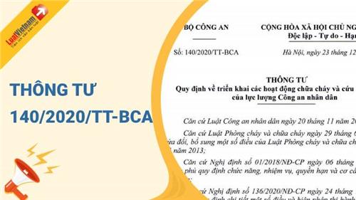Ngày 23/12/2020, Bộ Công an ban hành Thông tư 140/2020/TT-BCA quy định về triển khai các hoạt động chữa cháy và cứu nạn, cứu hộ của lực lượng Công an nhân dân.