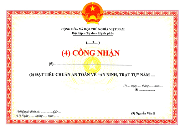 (5) Dòng thứ năm ghi tên khu dân cư, xã, phường, đặc khu, cơ quan, doanh nghiệp, cơ sở giáo dục được công nhận “An toàn về an ninh, trật tự”, chữ in thường, phông chữ “Times New Roman”, cỡ chữ 18, chữ đứng, đậm.