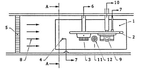 | 1 - Thể tích làm việc 2 - Bảng gắn mẫu 3 - Đầu báo đang được thử nghiệm 4 - Cảm biến nhiệt độ 5 - Bộ giảm xáo trộn thấp 6 - Thiết bị cấp nguồn và giám sát | 7 - Thiết bị điều khiển và đo lường 8 - Luồng không khí 9 - Buồng đo ion hóa (MIC) 10 - Đầu hút của máy MIC 11 - Máy đo độ cản sáng 12 - Tấm hắt sáng cho máy đo độ cản sáng |