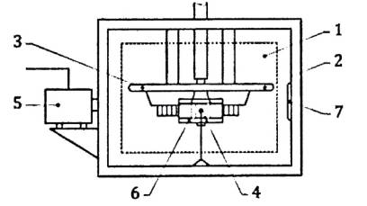 | 1 - Thể tích làm việc 2 - Bảng gắn mẫu 3 - Đầu báo đang được thử nghiệm 4 - Cảm biến nhiệt độ | 5 - Máy đo độ cản sáng 6 - Buồng đo ion hóa (MIC) 7 - Tấm hắt sáng cho máy đo độ cản sáng |