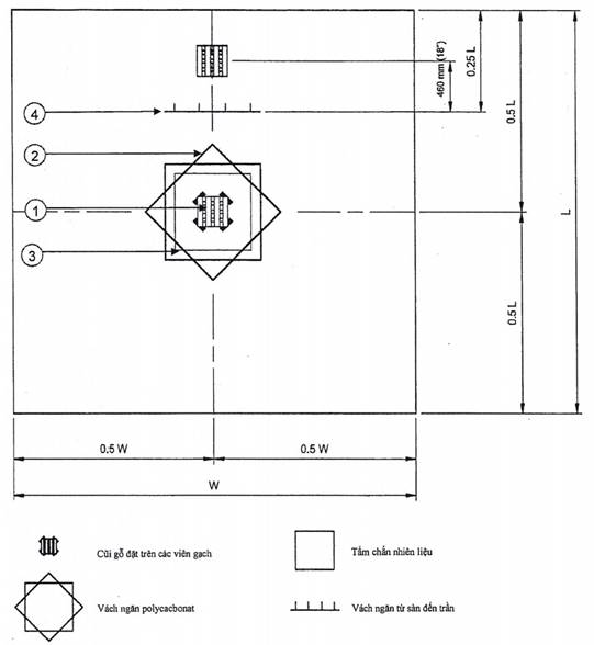 Hai vách ngăn bên ngoài có kích thước bằng hình vuông (1015 ± 15) mm và cao (305 ± 5) mm được bố trí xung quanh mặt ngoài của tấm chắn nhiên liệu như trong Hình 3. Các vách ngăn phải được đặt cao hơn sàn (90 ± 5) mm. Vách ngăn dưới phải được định hướng sao cho các mặt của nó song song với tấm chắn nhiên liệu và vách ngăn trên phải xoay 45° so với vách ngăn dưới.