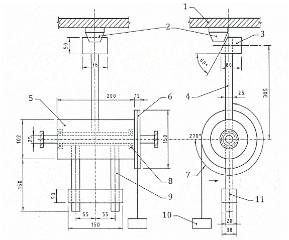 D.4 Đối diện với cán búa theo phương hướng kính là hai cánh tay đòn có đối trọng cân bằng, mỗi cánh tay đòn có đường kính ngoài 20 mm và chiều dài 185 mm các cánh tay đòn này được lắp ghép bằng ren bằng ống thép sao cho chiều dài của các phần nhô ra là 150 mm. Đối trọng cân bằng thép được lắp trên các cánh tay đòn sao cho vị trí của nó có thể điều chỉnh được để cân bằng với khối lượng của đầu búa và các cánh tay đòn như nêu trên Hình D.1. Trên một đầu mút của ống thép ở tâm có lắp một puli bằng hợp kim nhôm đường kính 150 mm, rộng 12 mm, có dây cáp không kép dài được quấn quanh với một đầu của cáp được cố định trên puli. Đầu kia của cáp buộc vào tải trong vận hành.