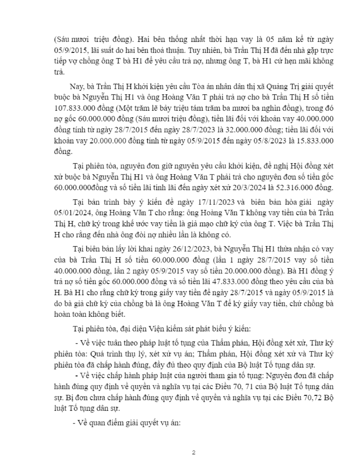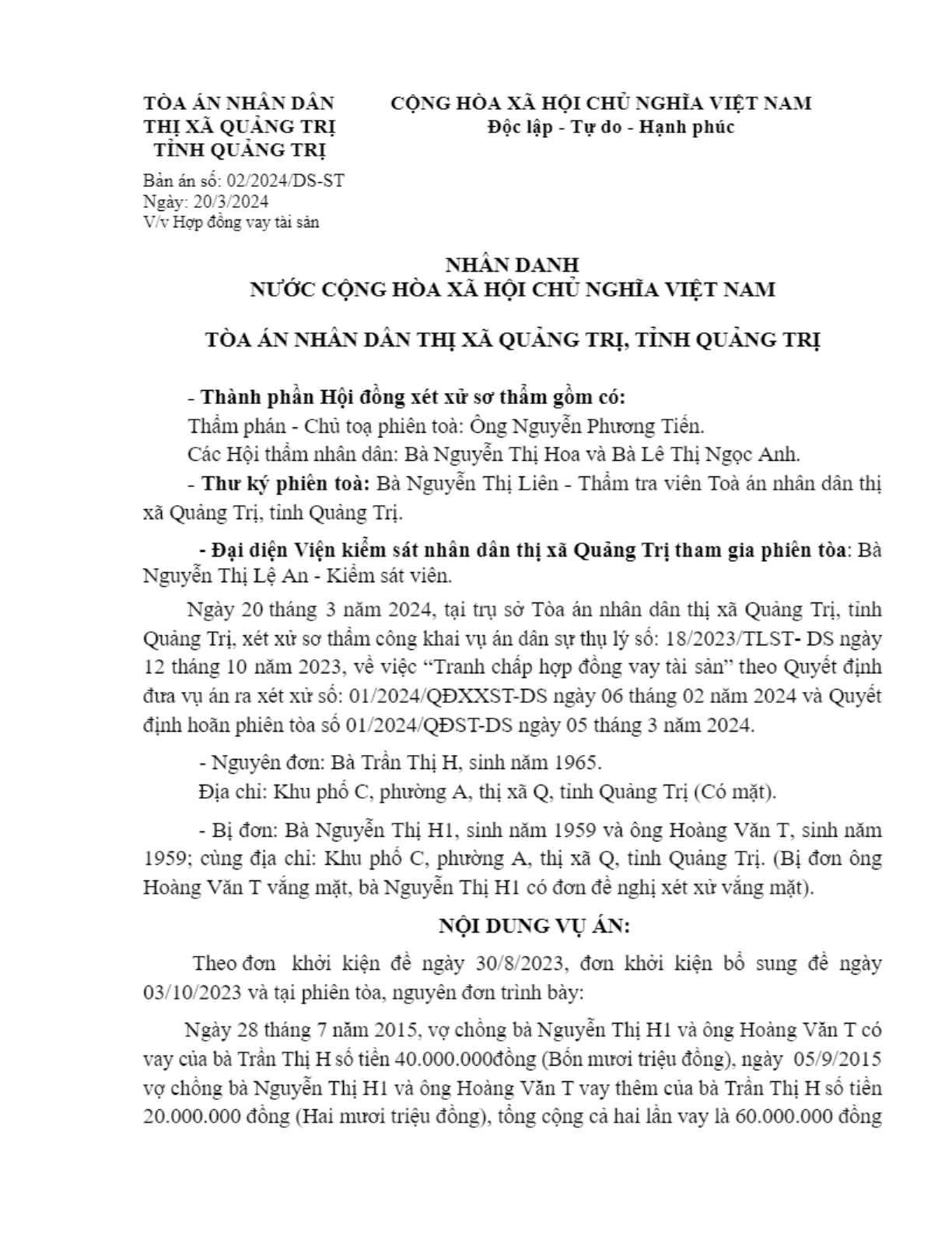 Bản án số 02/2024/DS-ST ngày 20/03/2024 của TAND TX. Quảng Trị, tỉnh Quảng Trị về tranh chấp hợp đồng vay tài sản