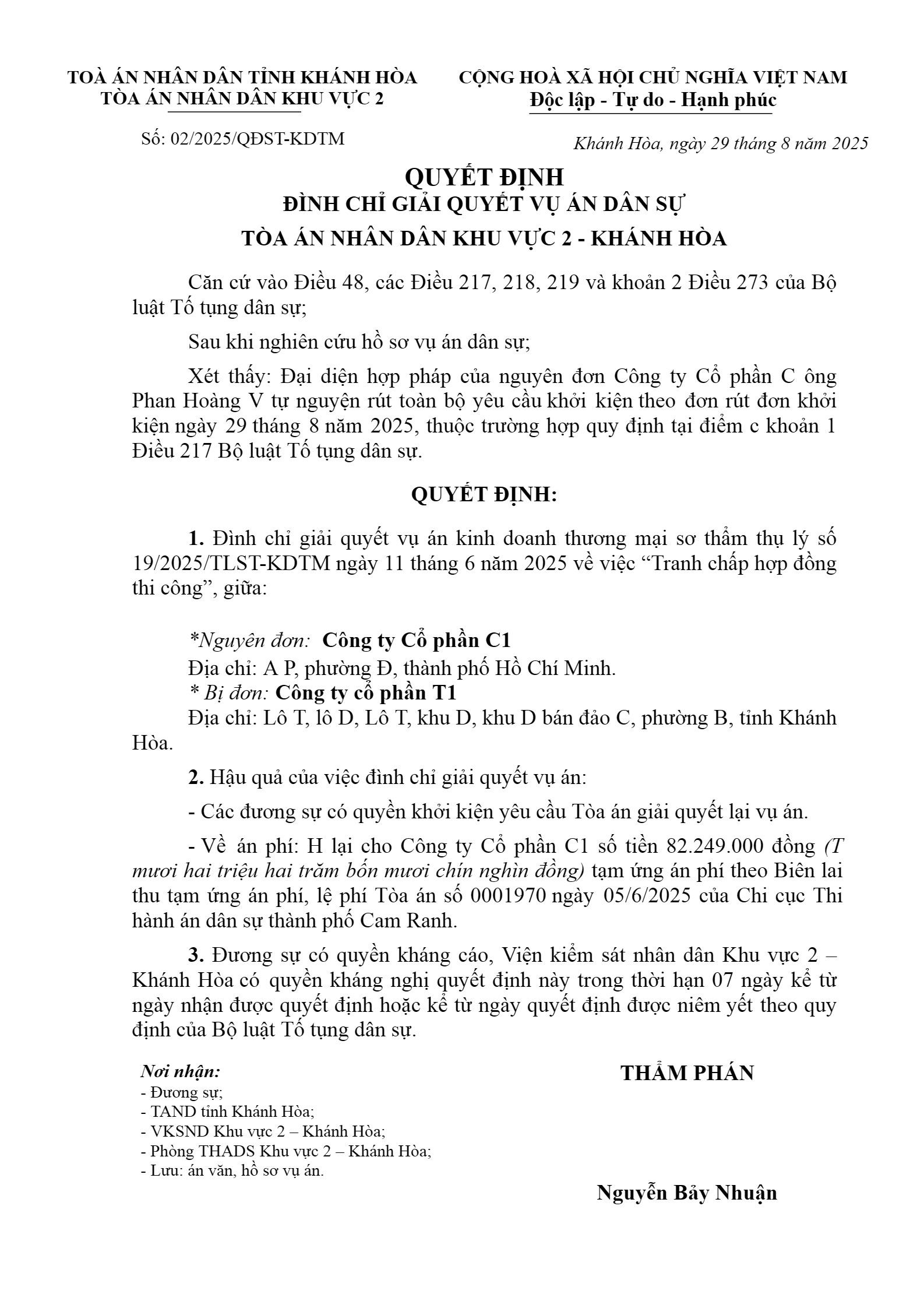 Bản án số 02/2025/DS-ST ngày 29/08/2025 của Tòa án nhân dân khu vực 2 - Khánh Hòa, tỉnh Khánh Hòa về tranh chấp hợp đồng dịch vụ