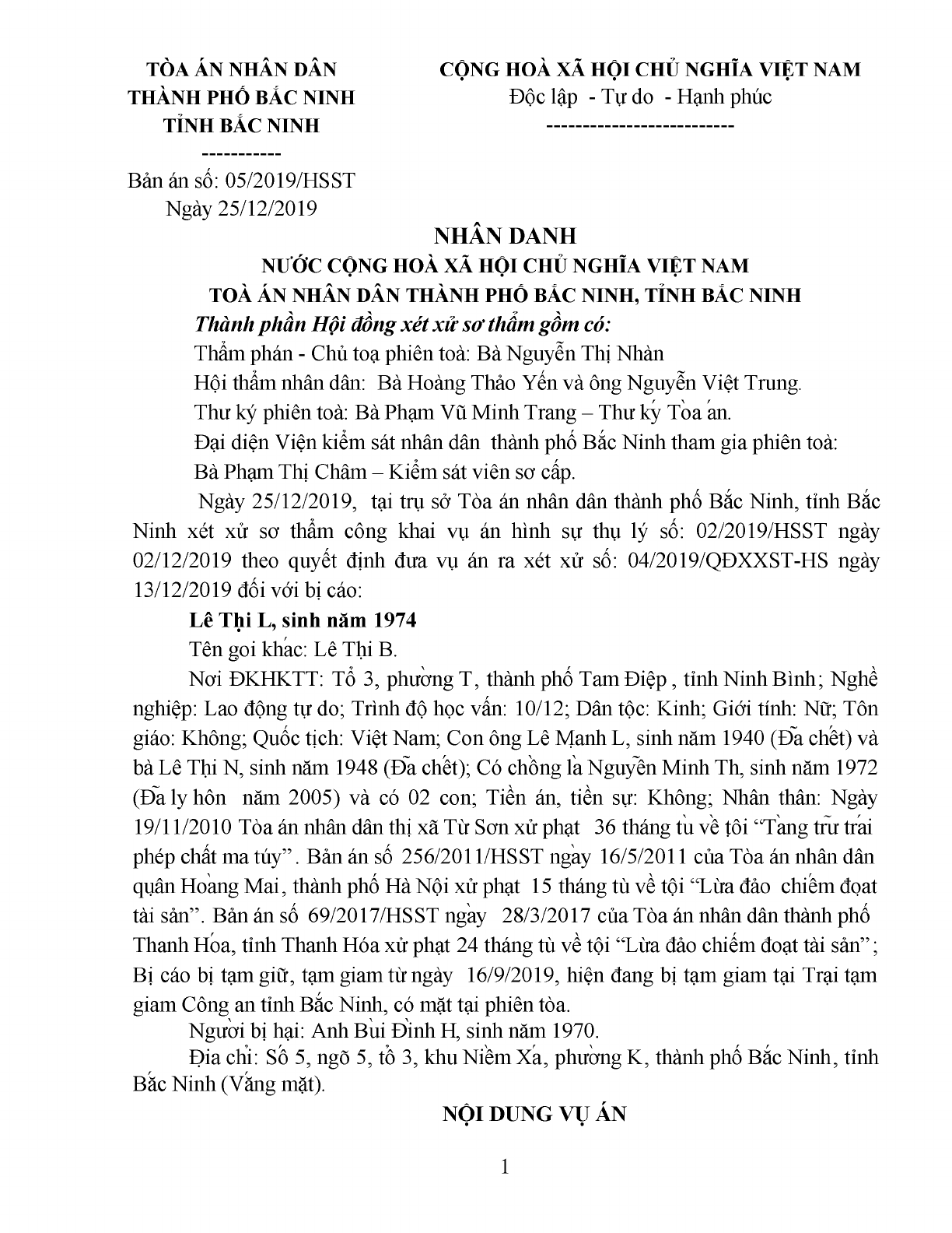 Bản án số 05/2019/HSST ngày 25/12/2019 của TAND TP. Bắc Ninh, tỉnh Bắc Ninh về tội lừa đảo chiếm đoạt tài sản