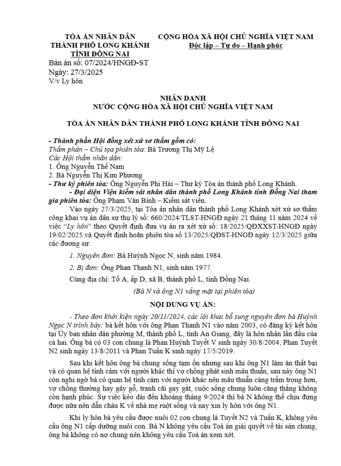 Bản án số 07/2025/HNGĐ-ST ngày 27/03/2025 của TAND TX. Long Khánh, tỉnh Đồng Nai về vụ án ly hôn về mâu thuẫn gia đình