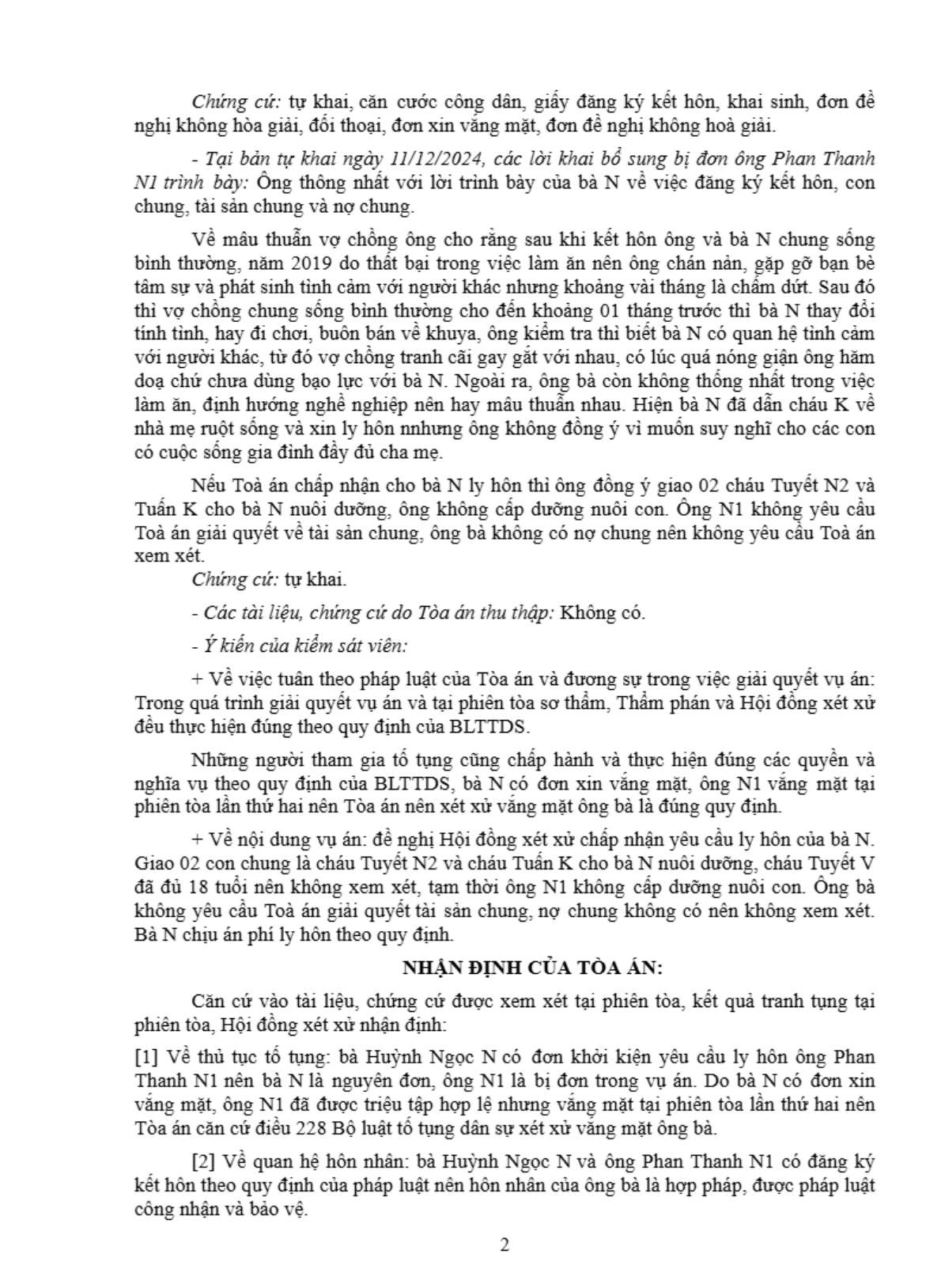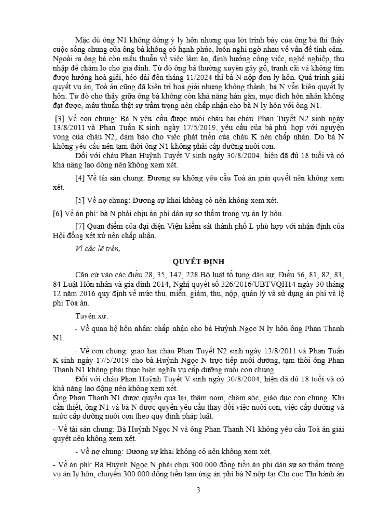 | Thông tin về vụ/việc: | bà Huỳnh Thị Nhung ly hôn với ông Phan Thanh Nhã |