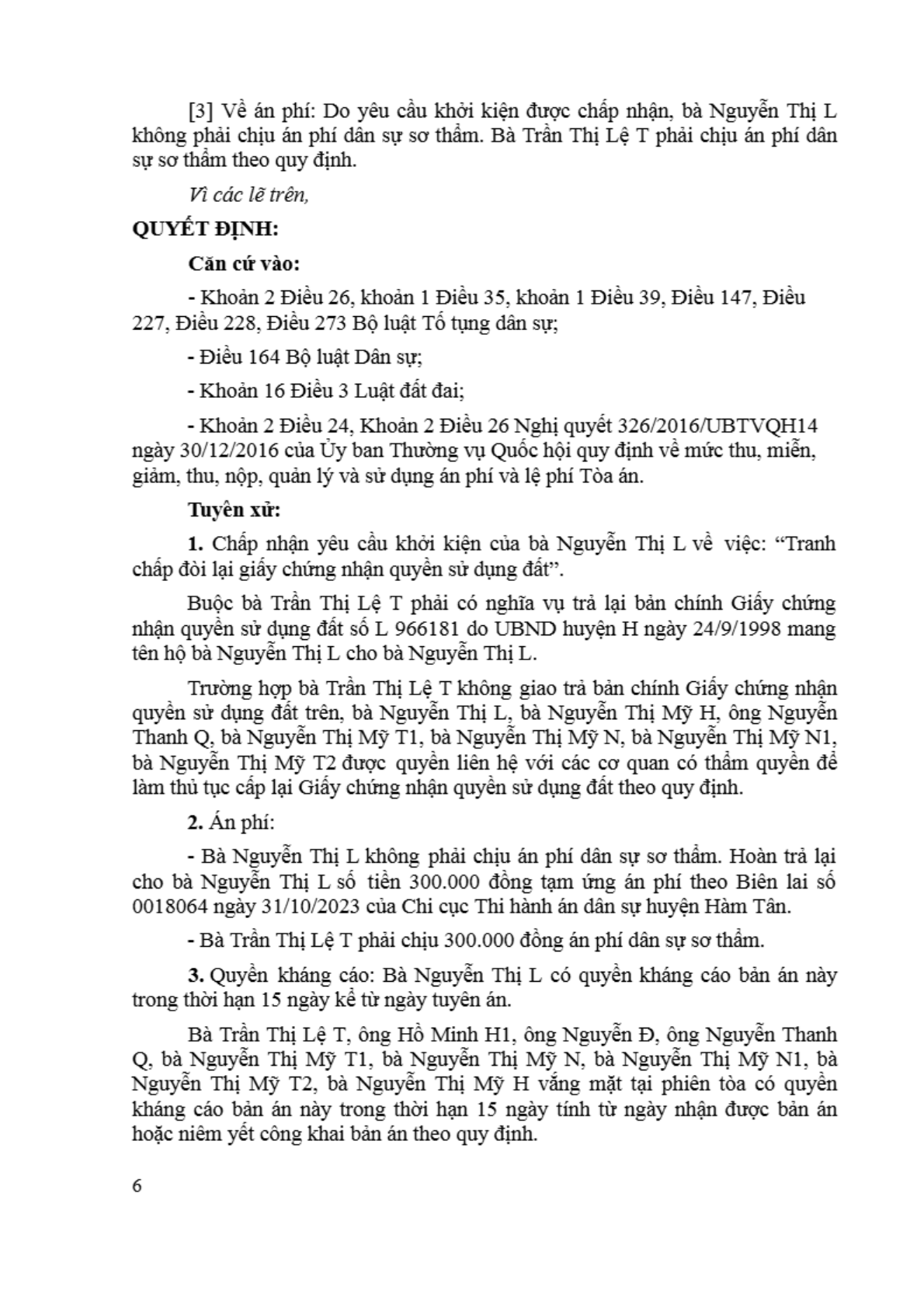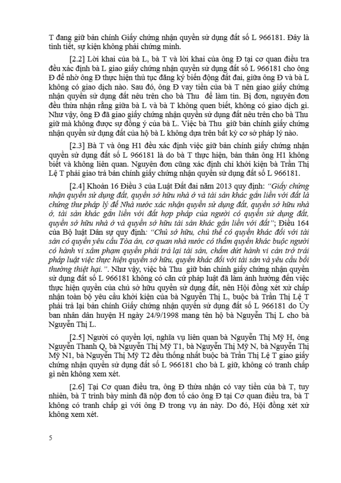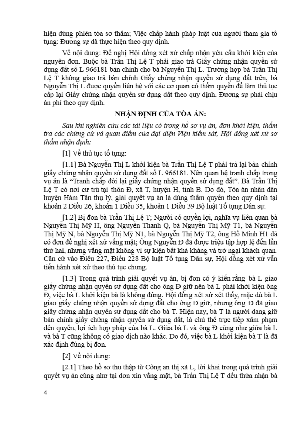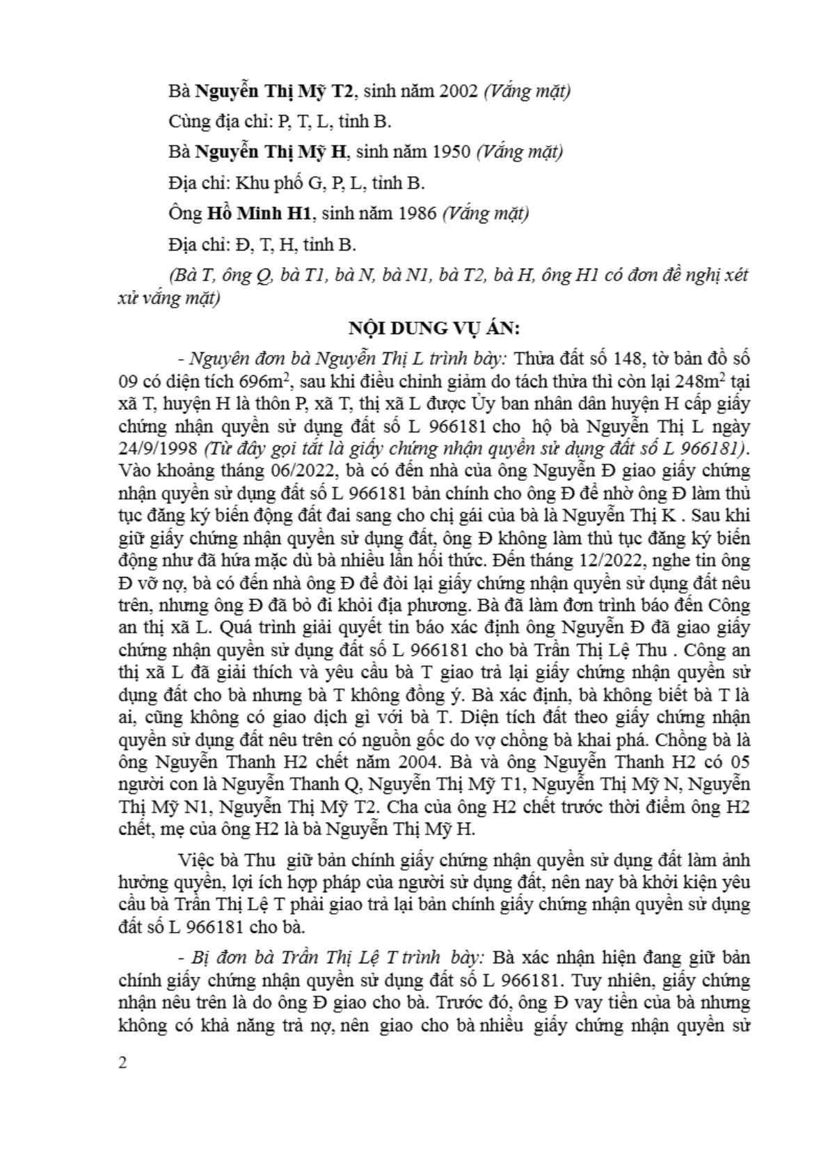 | Thông tin về vụ/việc: | đòi lại giấy chứng nhận quyền sử dụng đất |