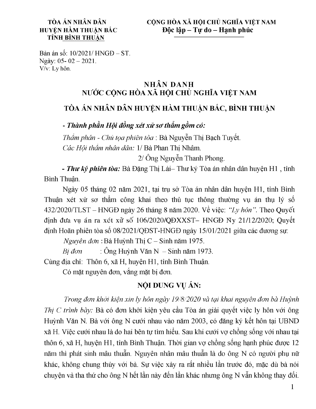 Bản án số 10/2021/HNGĐ-ST ngày 05/02/2021 của TAND huyện Hàm Thuận Bắc, tỉnh Bình Thuận về ly hôn
