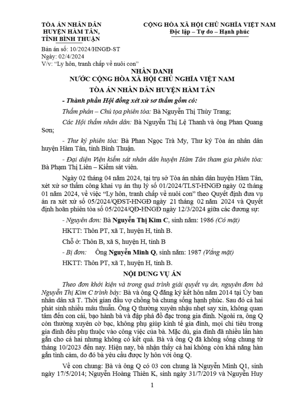 Bản án số 10/2024/HNGĐ-ST ngày 02/04/2024 của TAND huyện Hàm Tân, tỉnh Bình Thuận về vụ án ly hôn về mâu thuẫn gia đình
