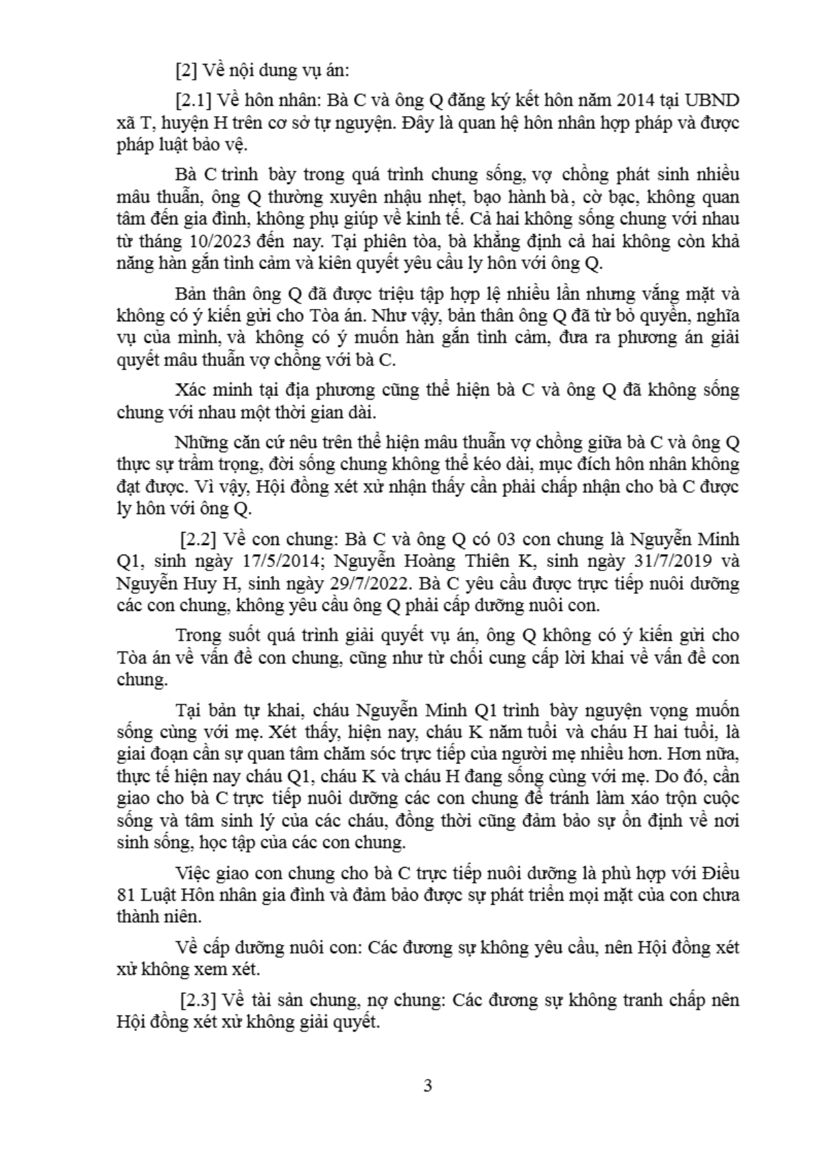 | Thông tin về vụ/việc: | bà C yêu cầu ly hôn Q |