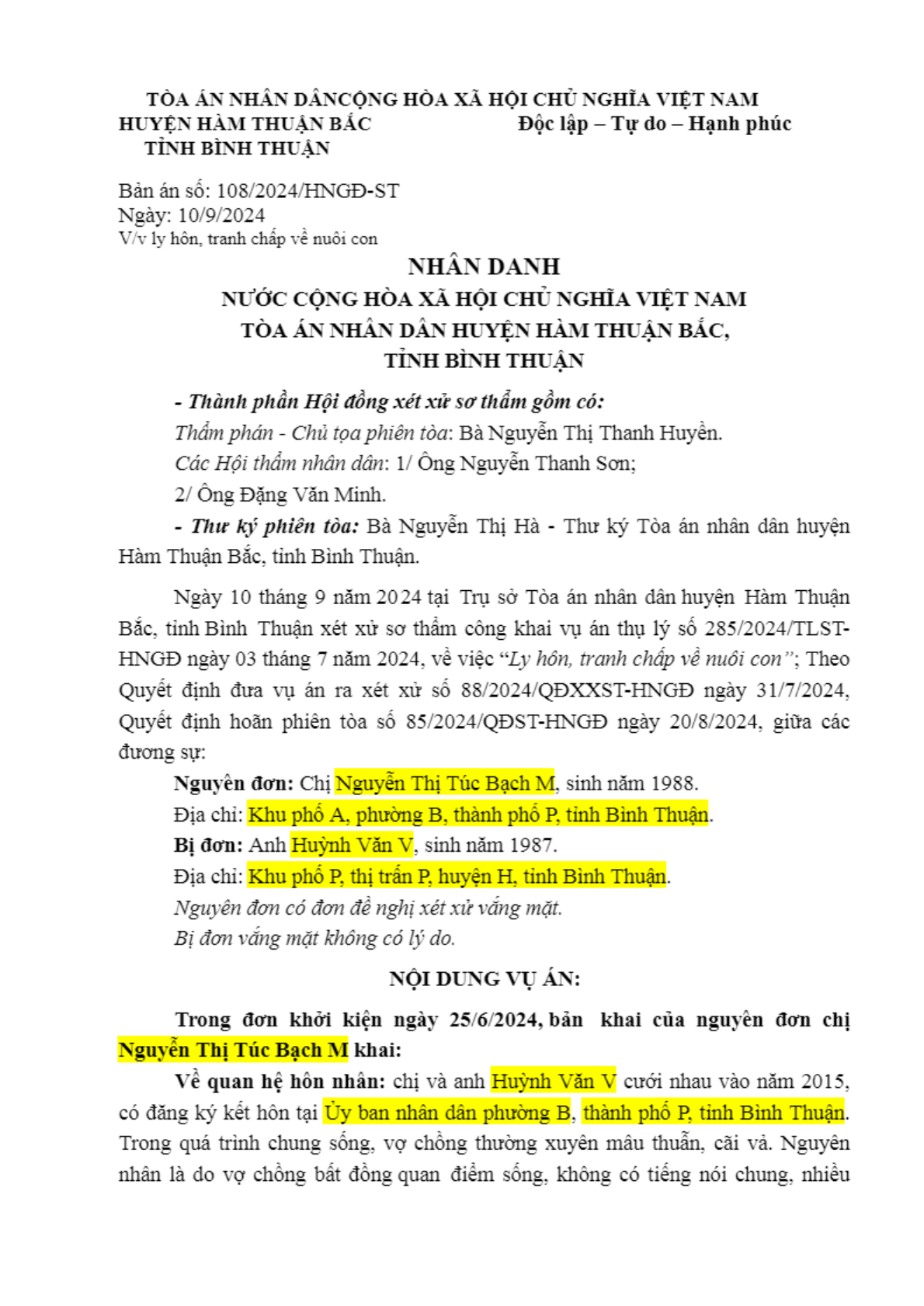 Bản án số 108/2024/HNGĐ-ST ngày 30/09/2024 của TAND huyện Hàm Thuận Bắc, tỉnh Bình Thuận về vụ án ly hôn về mâu thuẫn gia đình