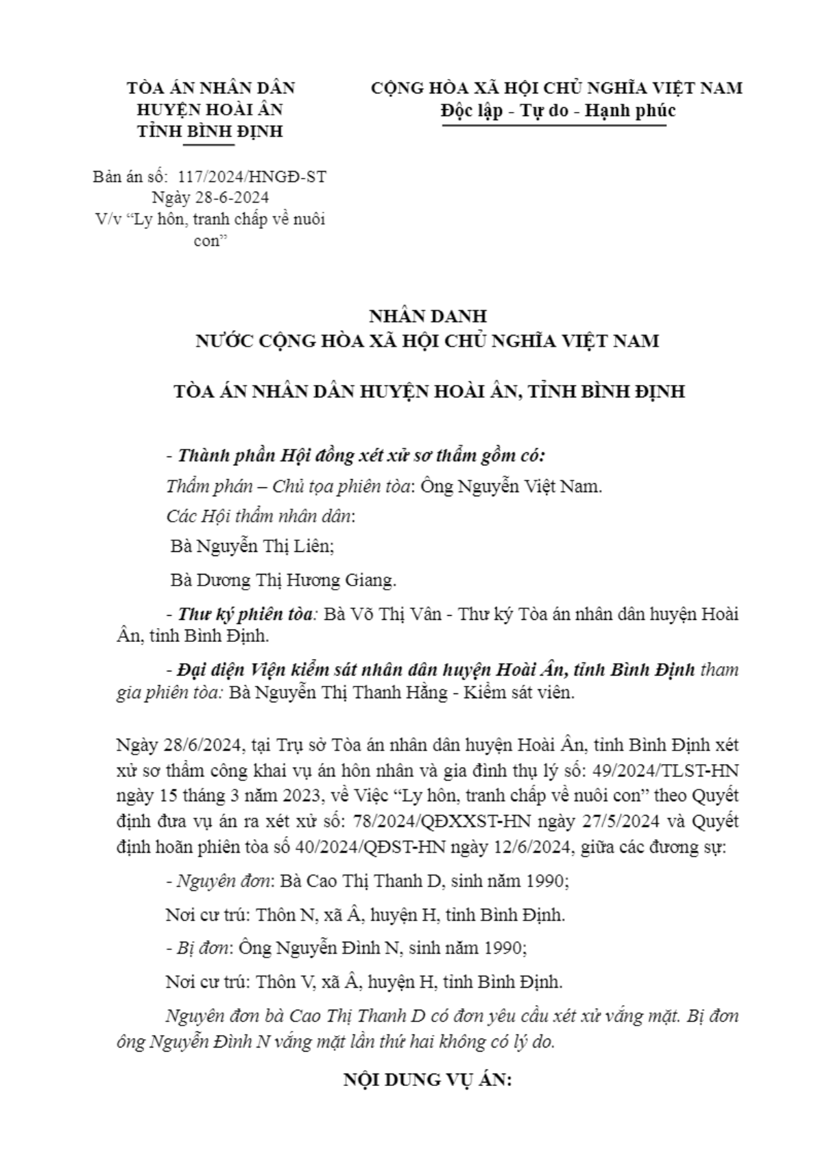 | Tên Bản án: | Bản án số 117/2024/HNGĐ-ST ngày 28/06/2024 của TAND huyện Hoài Ân, tỉnh Bình Định về vụ án ly hôn về mâu thuẫn gia đình |