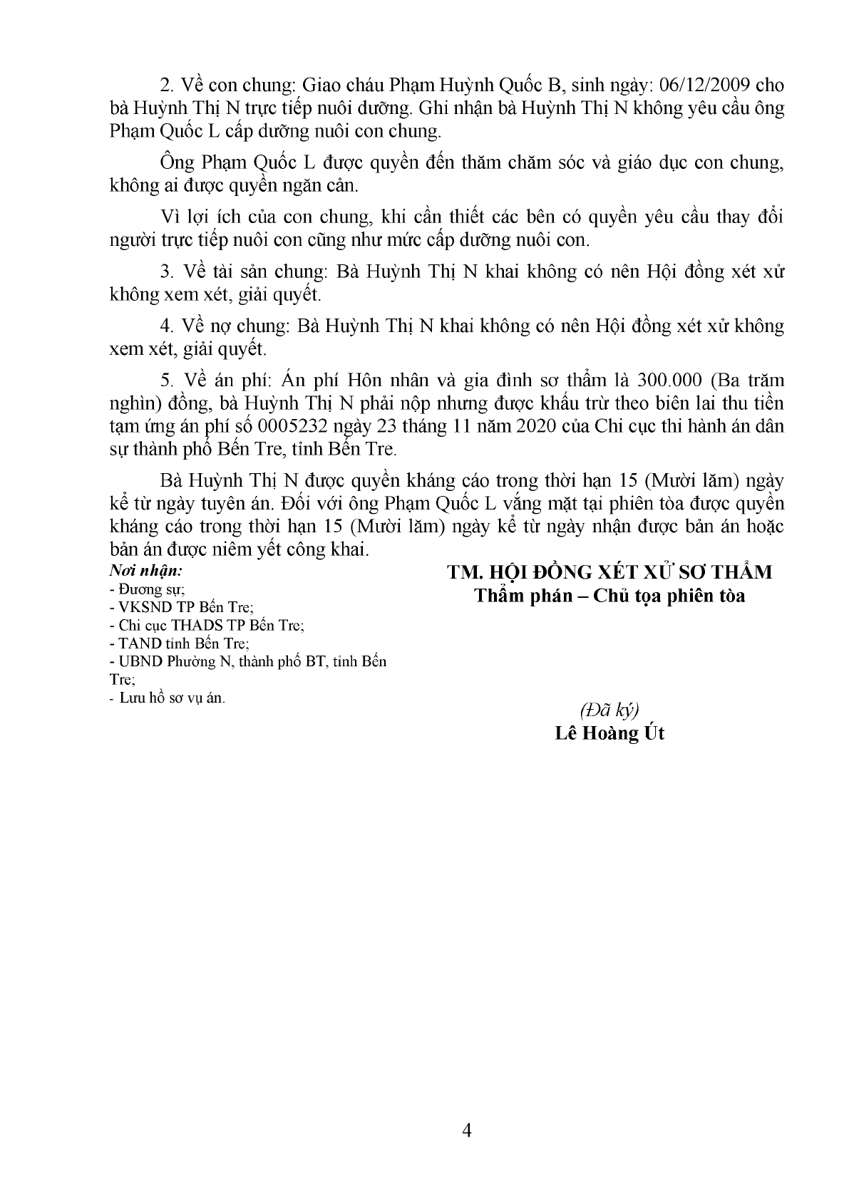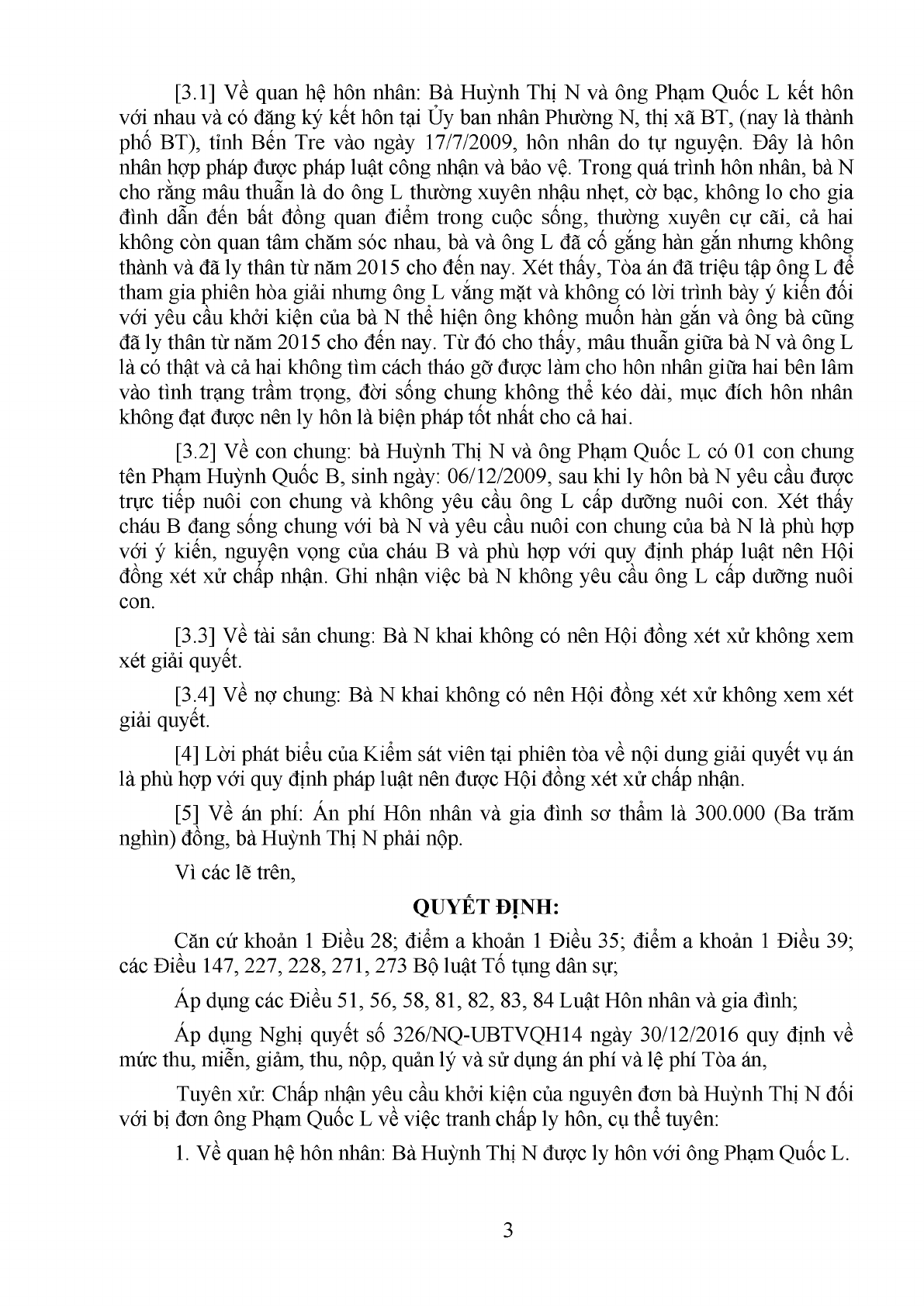 | Thông tin về vụ/việc: | Huỳnh Thị N, Phạm Quốc L được ly hôn |