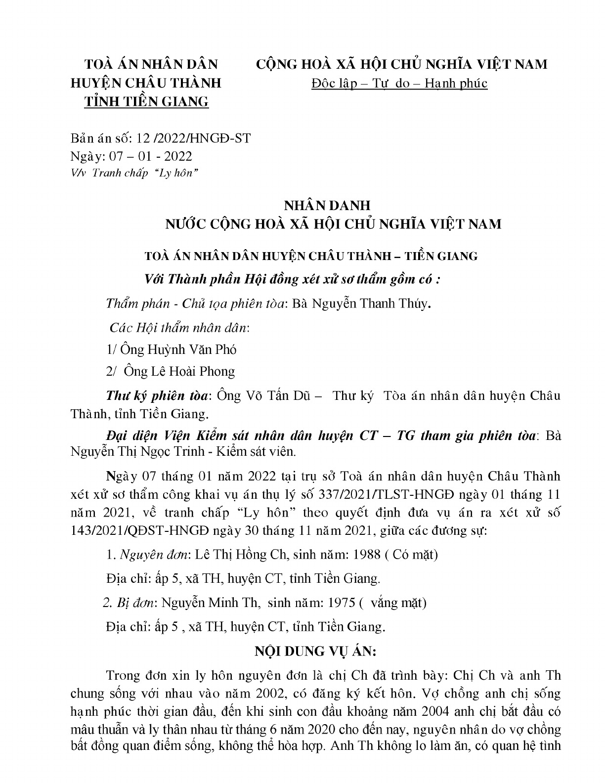 Bản án số 12/2022/HNGĐ-ST ngày 07/01/2022 của TAND huyện Châu Thành, tỉnh Tiền Giang về tranh chấp ly hôn