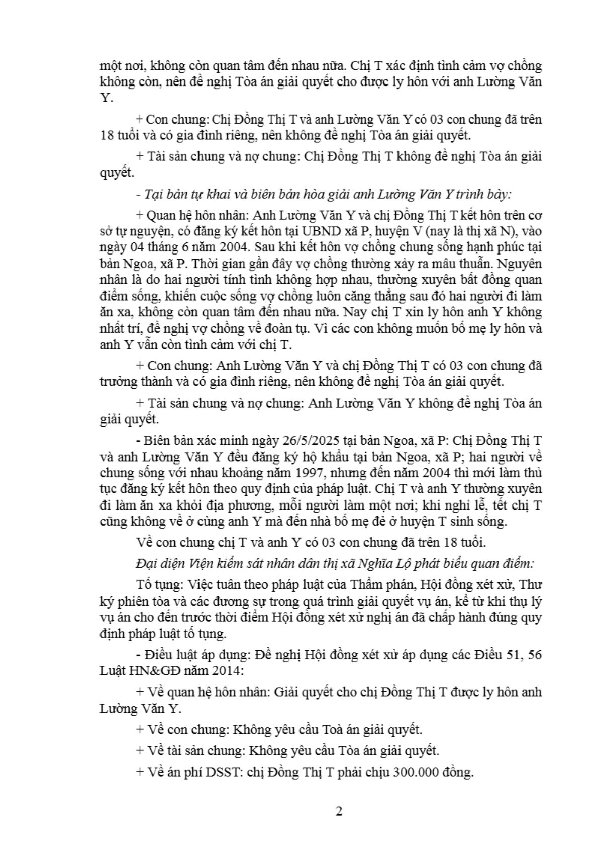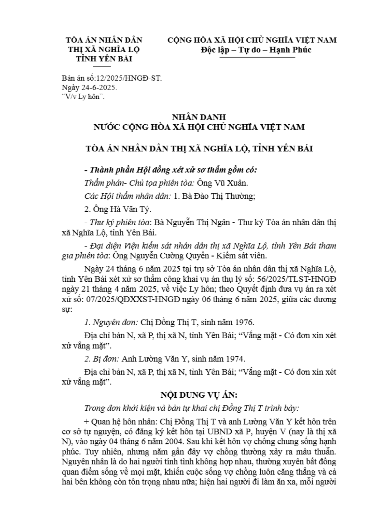 | Thông tin về vụ/việc: | Chị Đồng Thị T xin ly hôn anh Lường Văn Yên |