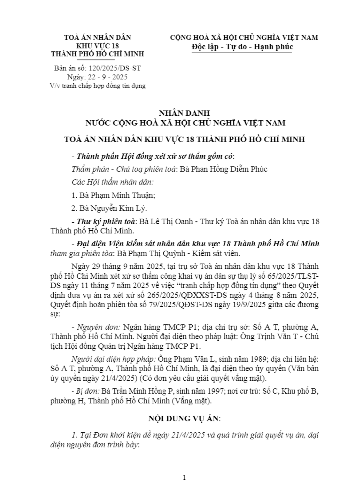 | Tên Bản án: | Bản án số 120/2025/DS-ST ngày 22/09/2025 của Tòa án nhân dân khu vực 18 - Hồ Chí Minh, TP. Hồ Chí Minh về tranh chấp hợp đồng tín dụng |