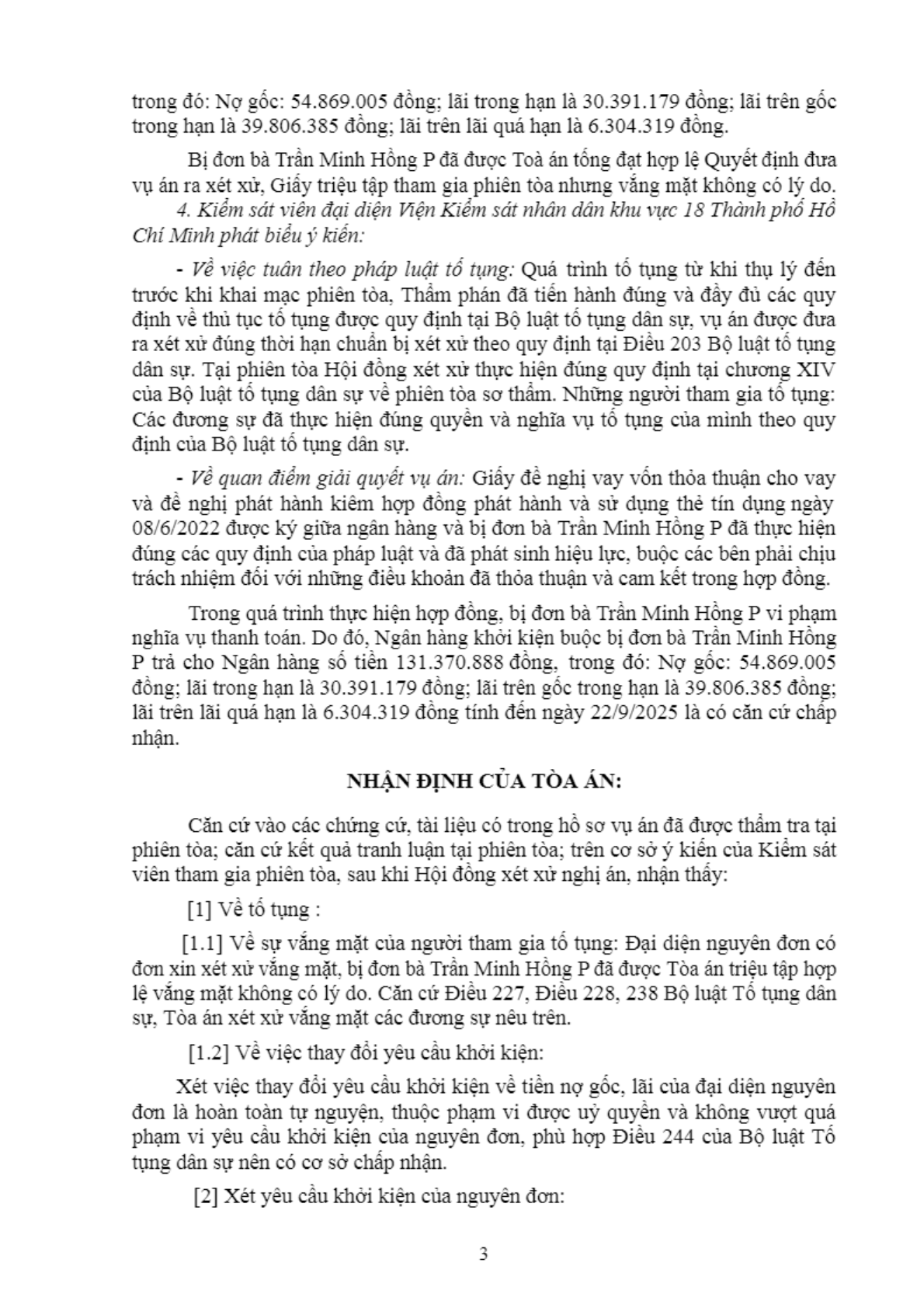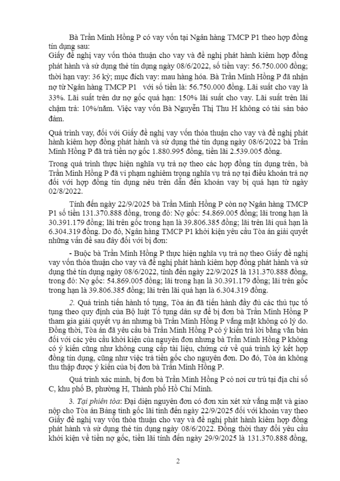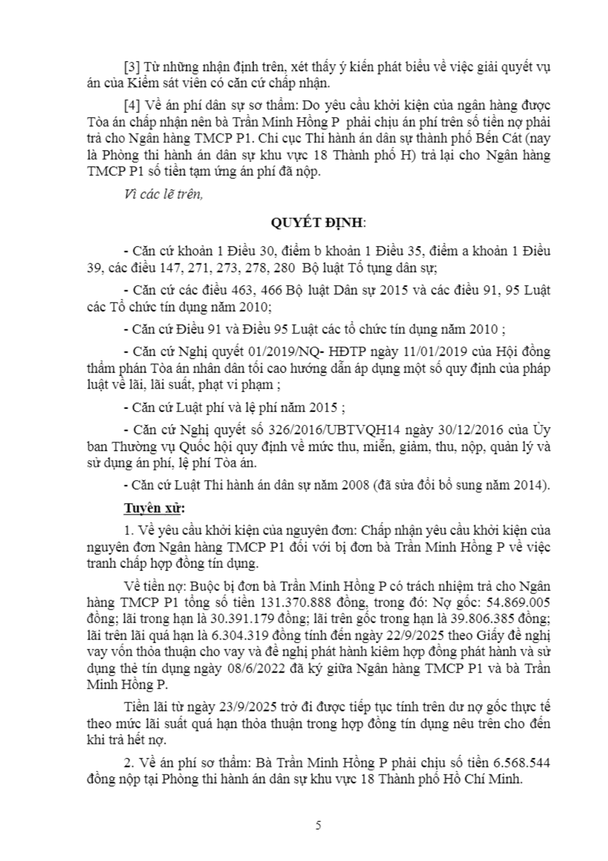 | Thông tin về vụ/việc: | Ngân hàng TMCP P và bà Trần Minh Hồng P tranh chấp hợp đồng tín dụng |