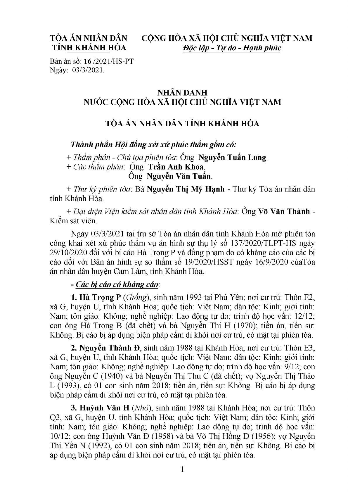 | Tòa án xét xử: | TAND tỉnh Khánh Hòa |