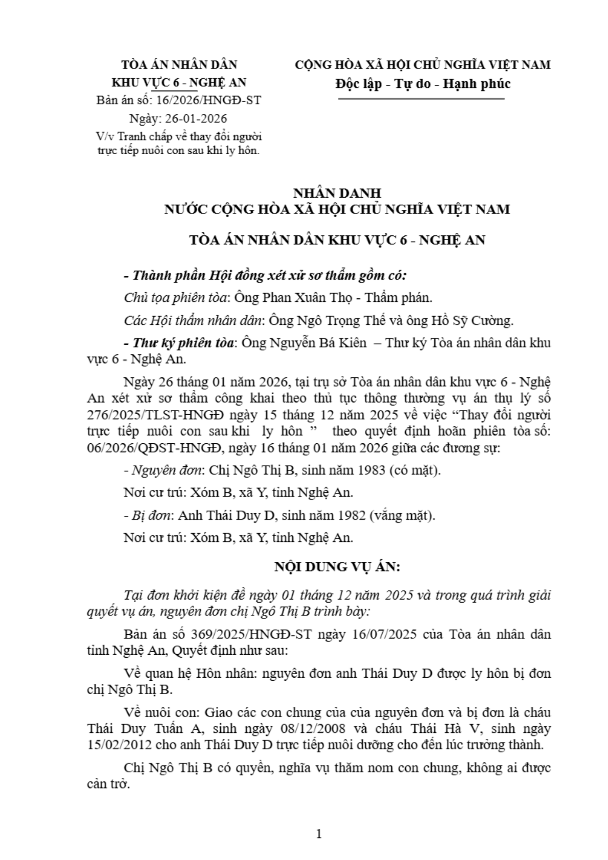 | Tên Bản án: | Bản án số 16/2026/HNGĐ-ST ngày 26/01/2026 của Tòa án nhân dân khu vực 6 - Nghệ An, tỉnh Nghệ An về tranh chấp về thay đổi người trực tiếp nuôi con sau khi ly hôn |
