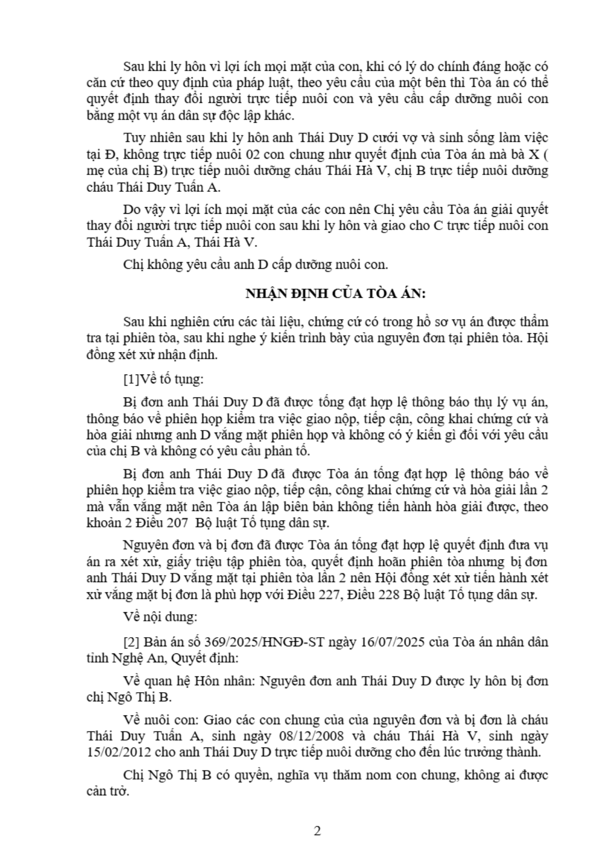 Bản án số 16/2026/HNGĐ-ST ngày 26/01/2026 của Tòa án nhân dân khu vực 6 - Nghệ An, tỉnh Nghệ An về tranh chấp về thay đổi người trực tiếp nuôi con sau khi ly hôn
