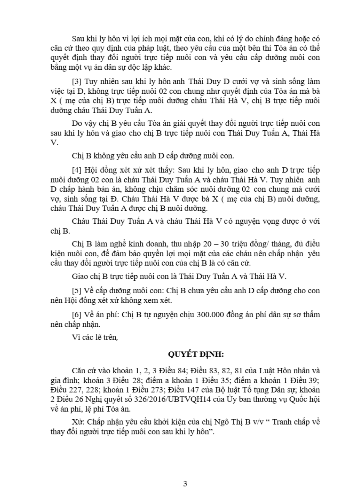 | Quan hệ pháp luật: | Tranh chấp về thay đổi người trực tiếp nuôi con sau khi ly hôn |