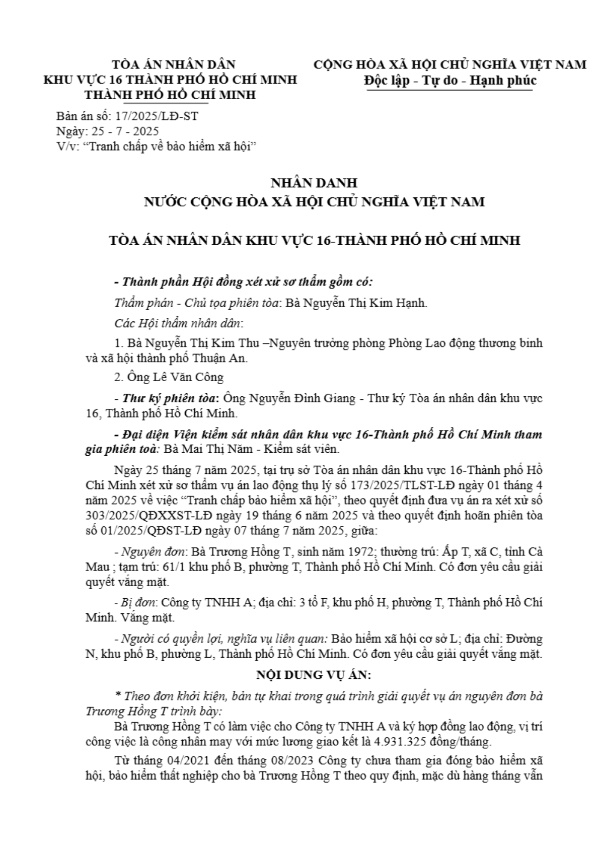 Bản án số 17/2025/LĐ-ST ngày 25/07/2025 của Tòa án nhân dân khu vực 16 - Hồ Chí Minh, TP. Hồ Chí Minh về tranh chấp về bảo hiểm xã hội, bảo hiểm y tế, bảo hiểm thất nghiệp, bảo hiểm tai nạn lao động, bệnh nghề nghiệp