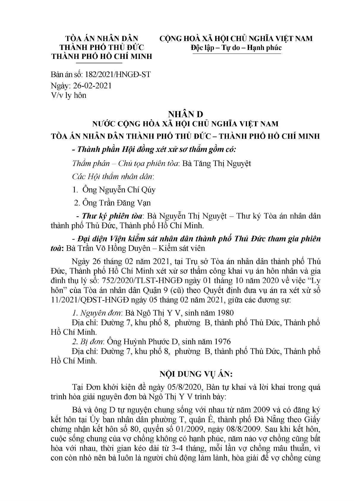 Bản án số 182/2021/HNGĐ-ST ngày 26/02/2021 của TAND Q. Thủ Đức, TP. Hồ Chí Minh về ly hôn