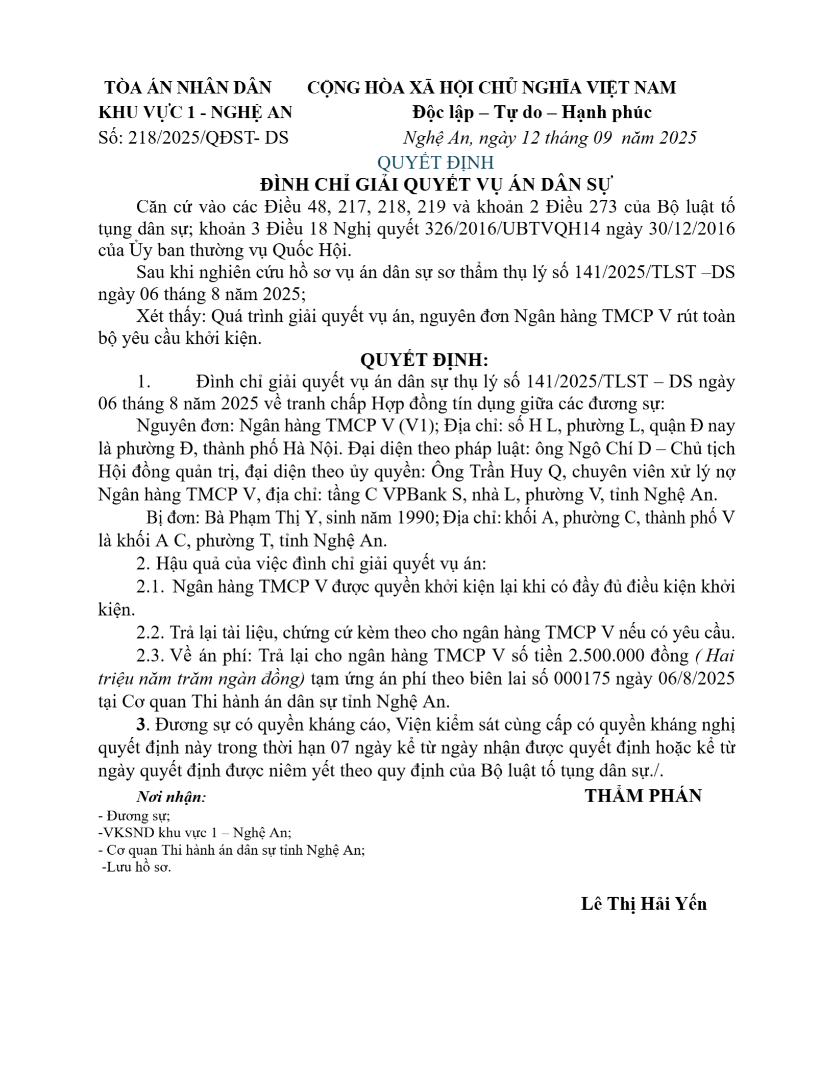 | Tên Bản án: | Bản án số 218/2025/DS-ST ngày 12/09/2025 của Tòa án nhân dân khu vực 1 - Nghệ An, tỉnh Nghệ An về tranh chấp hợp đồng tín dụng |