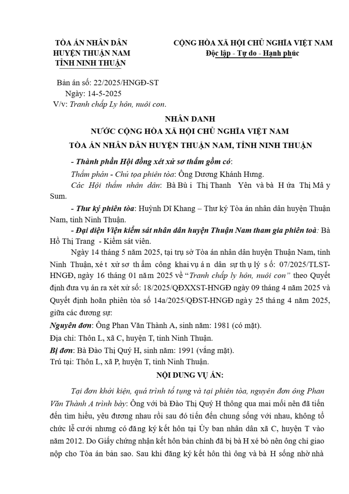 | Tòa án xét xử: | TAND huyện Thuận Nam (TAND tỉnh Ninh Thuận) |