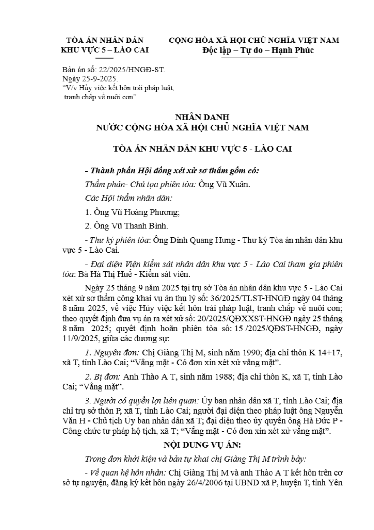 Bản án số 22/2025/HNGĐ-ST ngày 25/09/2025 của Tòa án nhân dân khu vực 5 - Lào Cai, tỉnh Lào Cai về yêu cầu huỷ việc kết hôn trái pháp luật