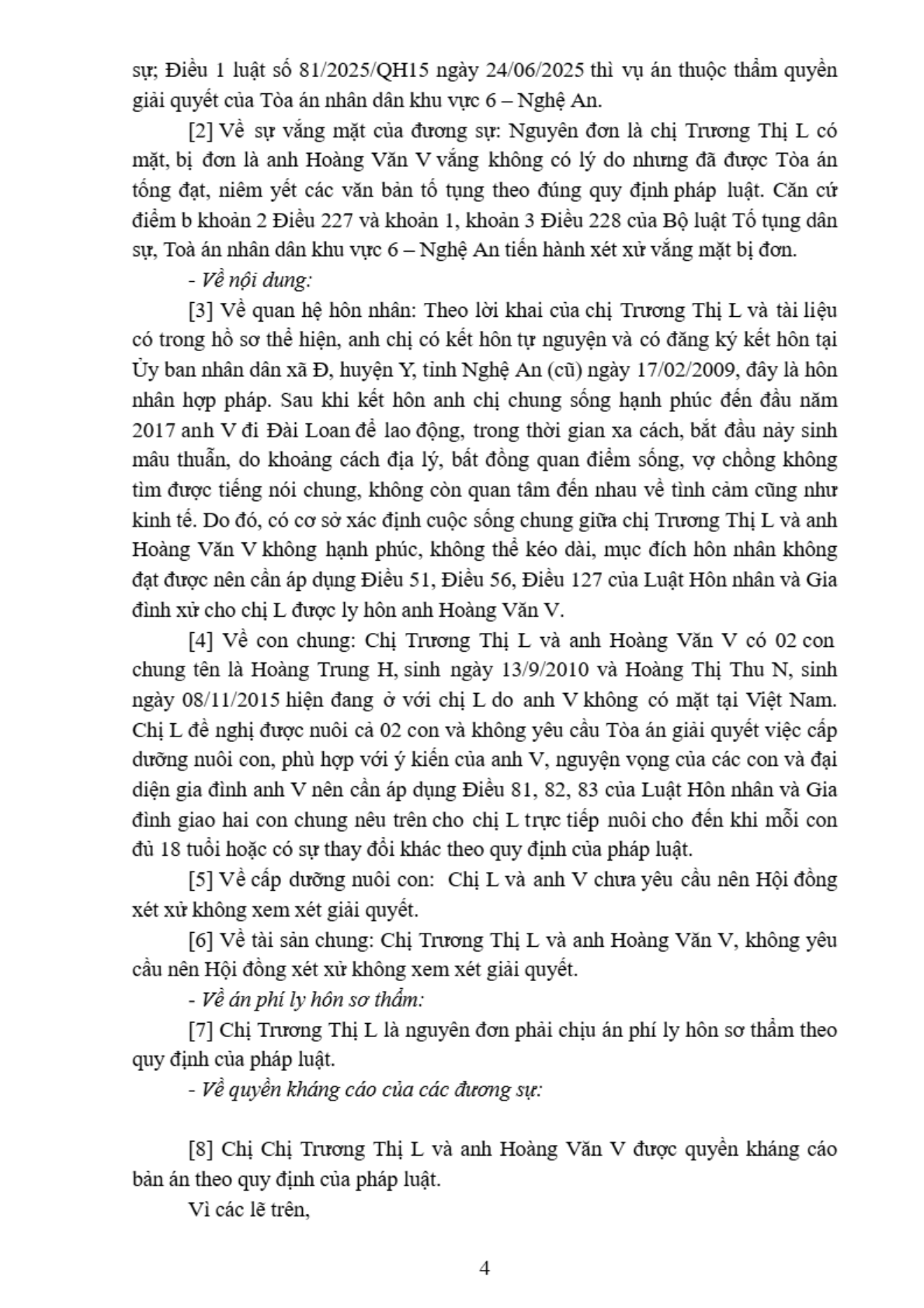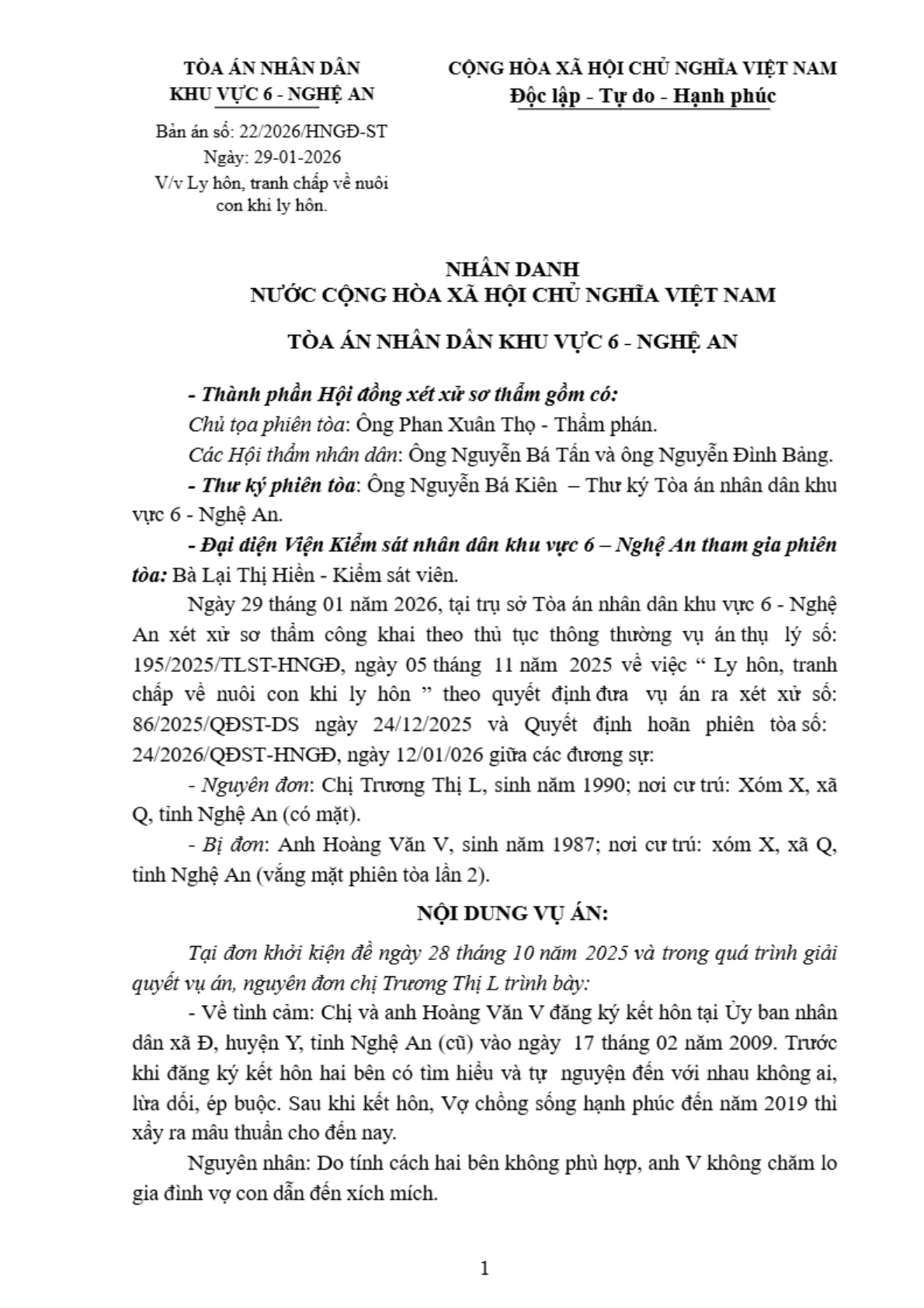 Bản án số 22/2026/HNGĐ-ST ngày 22/01/2026 của Tòa án nhân dân khu vực 6 - Nghệ An, tỉnh Nghệ An về vụ án ly hôn về mâu thuẫn gia đình