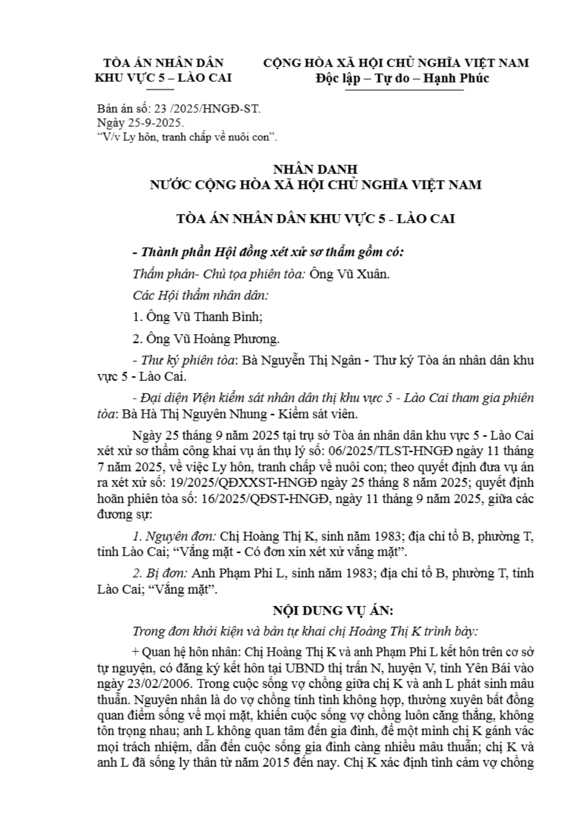 | Tên Bản án: | Bản án số 23/2025/HNGĐ-ST ngày 25/09/2025 của Tòa án nhân dân khu vực 5 - Lào Cai, tỉnh Lào Cai về vụ án ly hôn về mâu thuẫn gia đình |