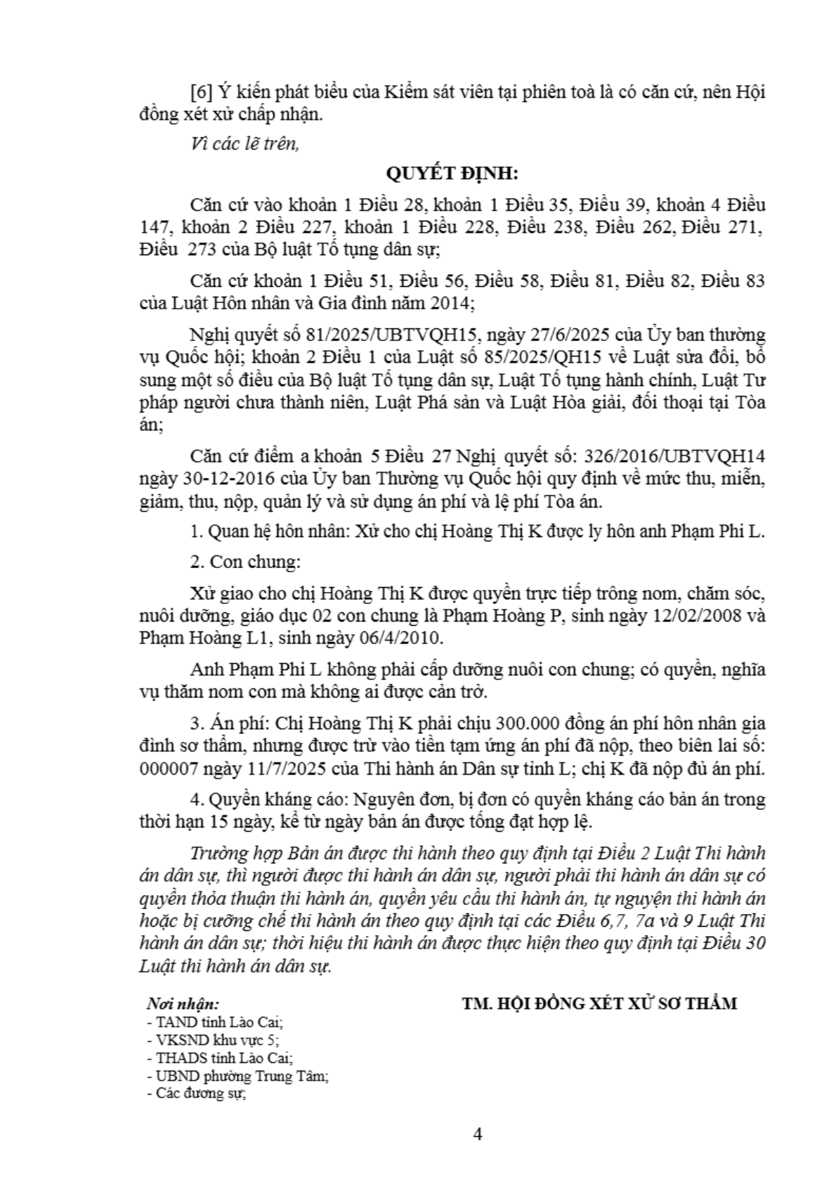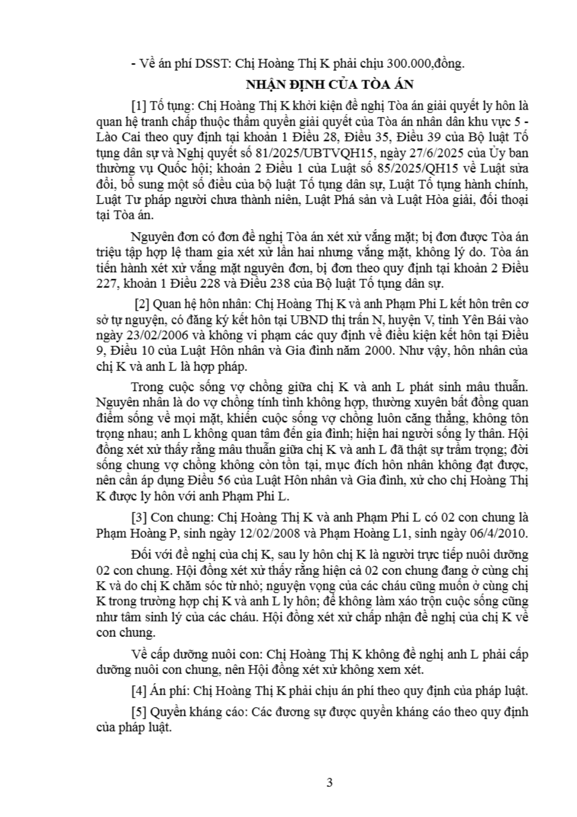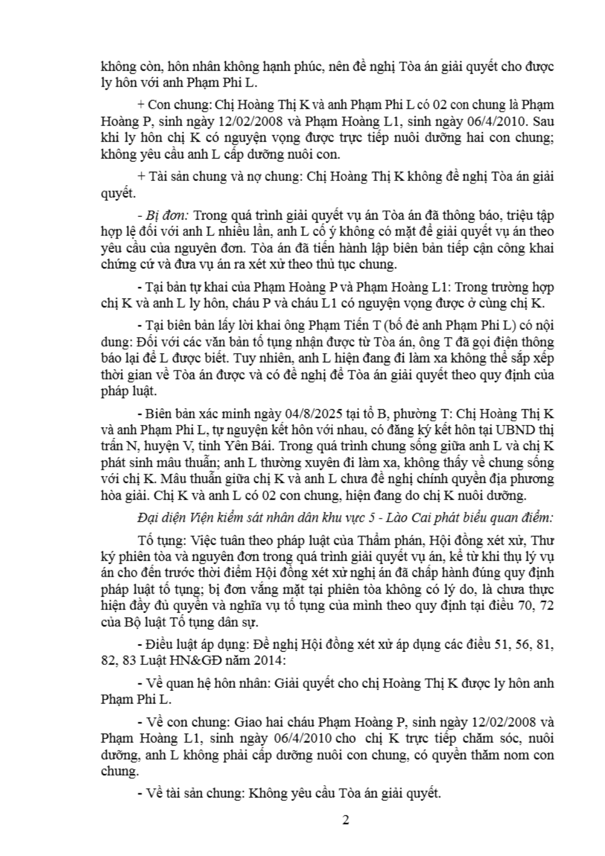 | Thông tin về vụ/việc: | Chị Hoàng Thị K xin ly hôn anh Phạm Phi L |