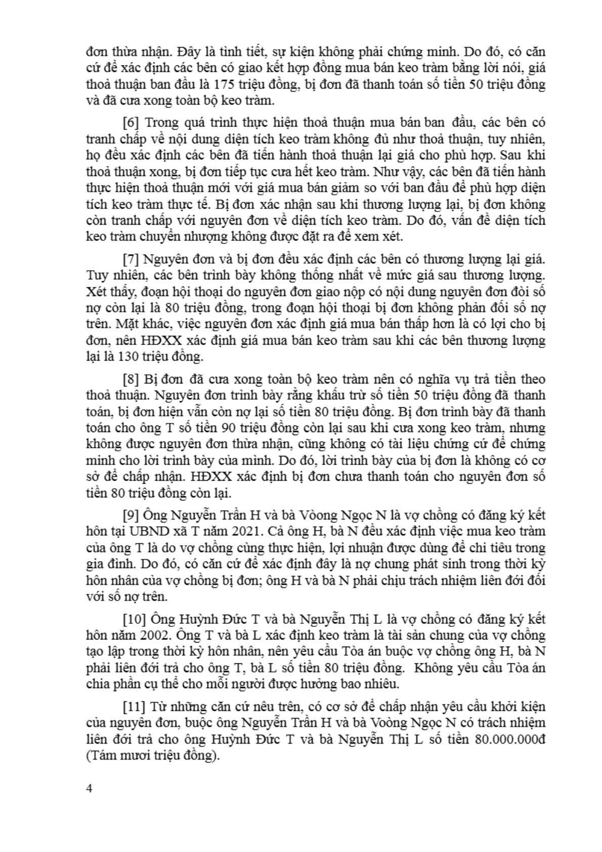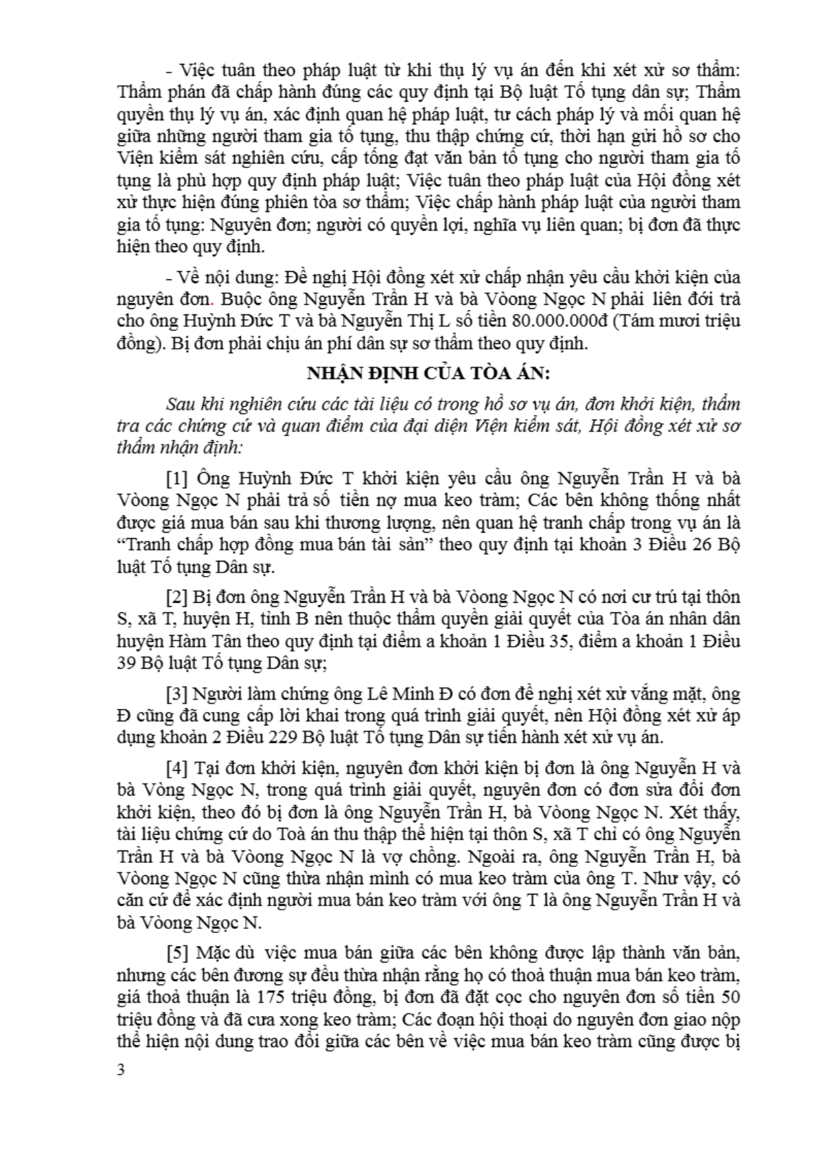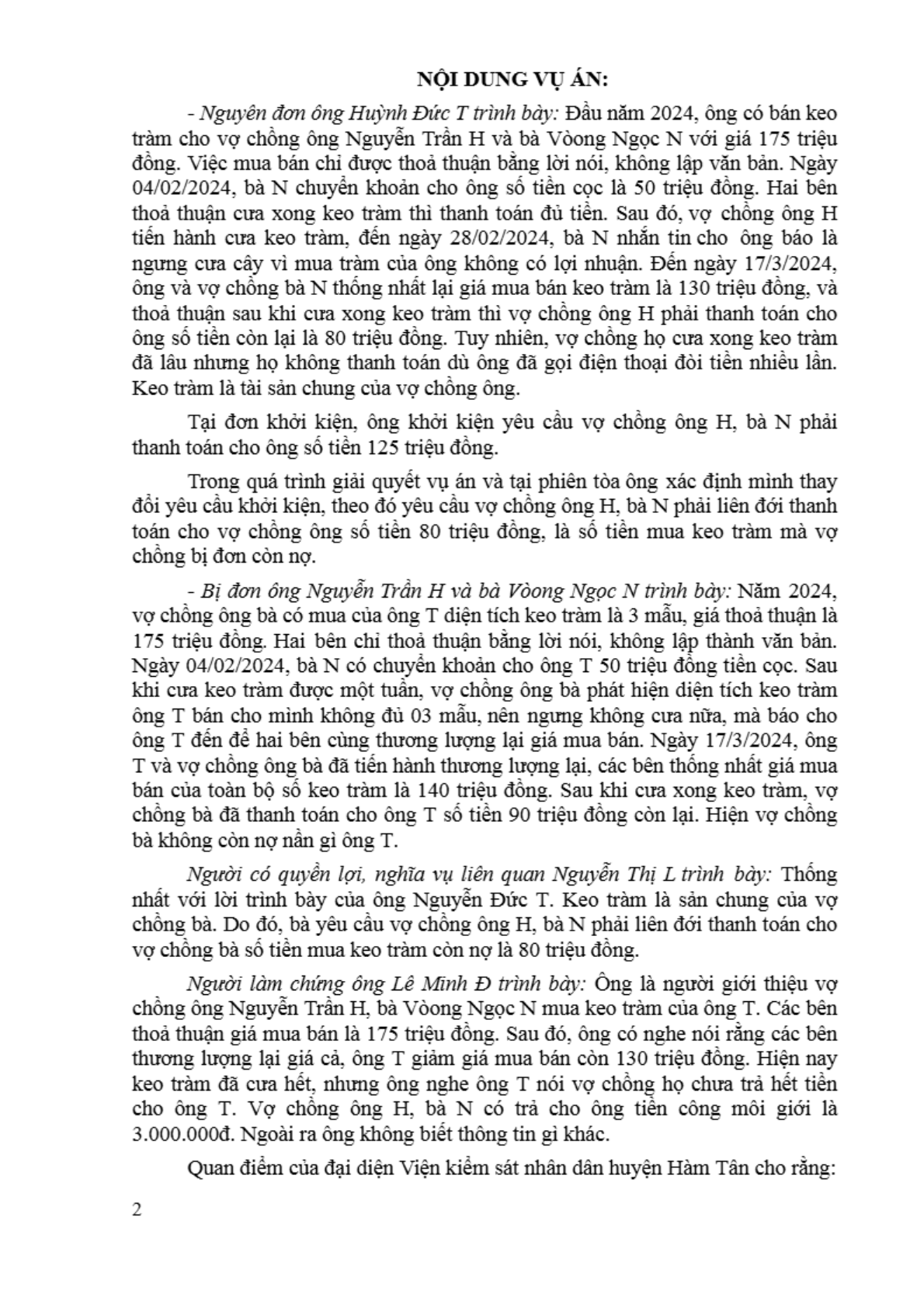 | Thông tin về vụ/việc: | ông T yêu cầu bà N, ông H trả tiền mua keo tràm còn nợ |