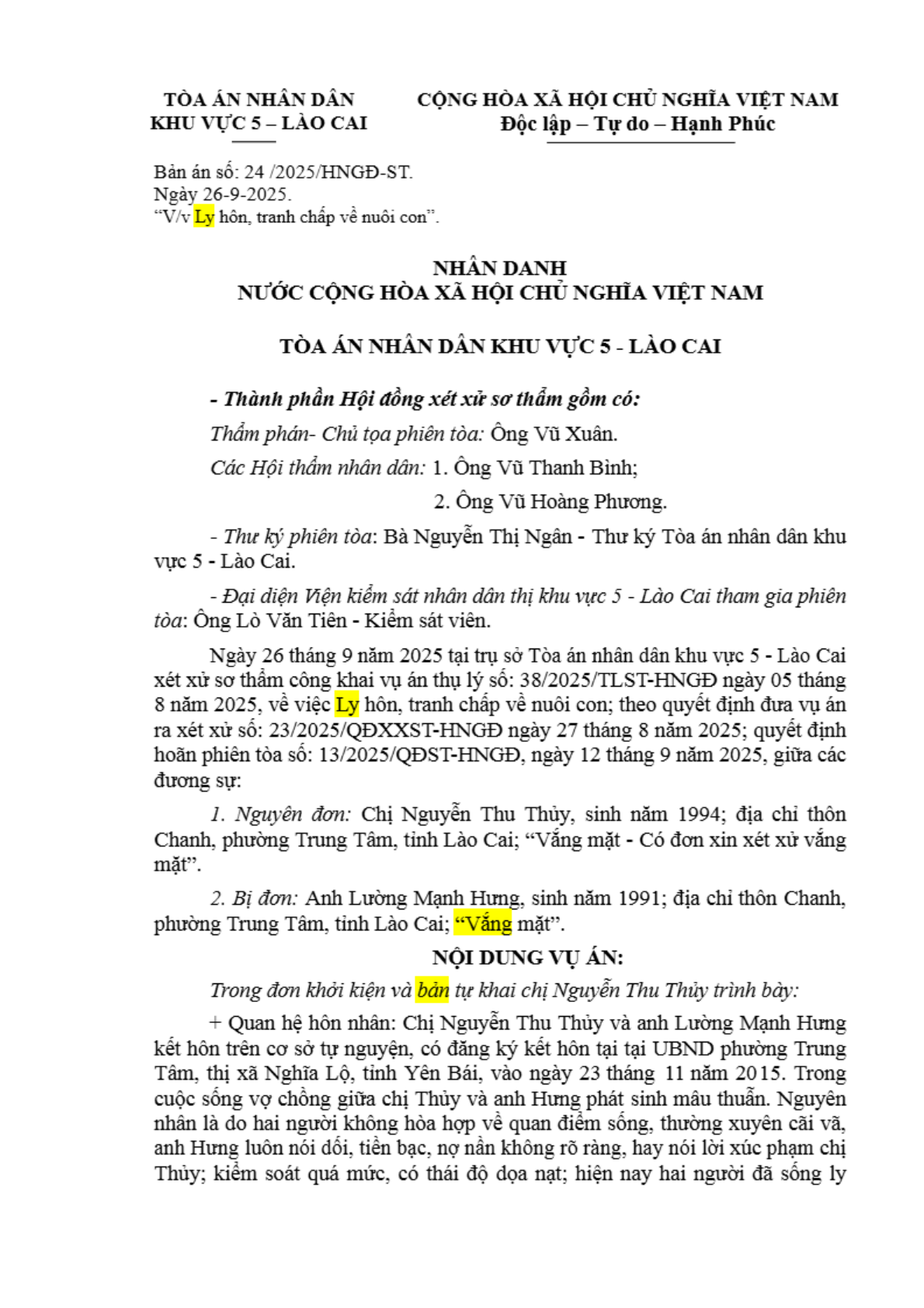 Bản án số 24/2025/HNGĐ-ST ngày 26/09/2025 của Tòa án nhân dân khu vực 5 - Lào Cai, tỉnh Lào Cai về vụ án ly hôn về mâu thuẫn gia đình