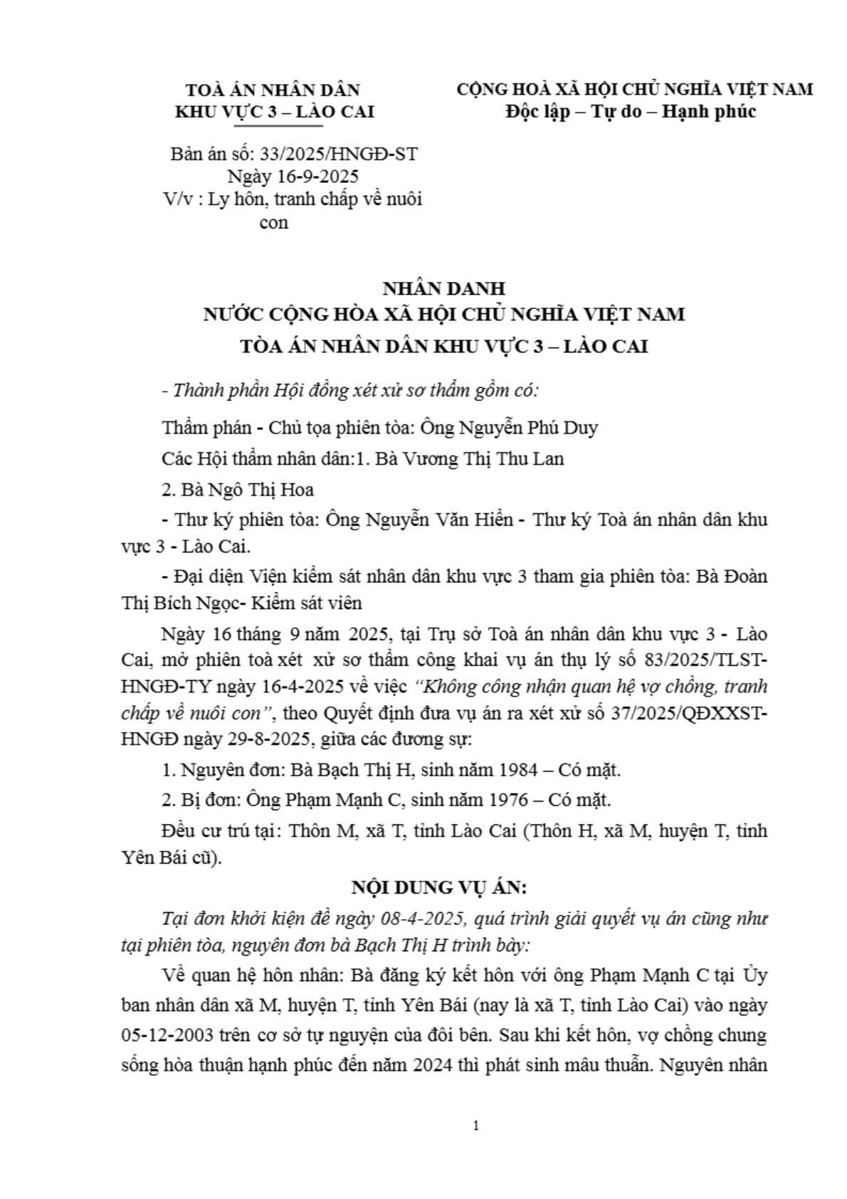 | Tên Bản án: | Bản án số 33/2025/HNGĐ-ST ngày 16/09/2025 của Tòa án nhân dân khu vực 3 - Lào Cai, tỉnh Lào Cai về vụ án ly hôn về mâu thuẫn gia đình |