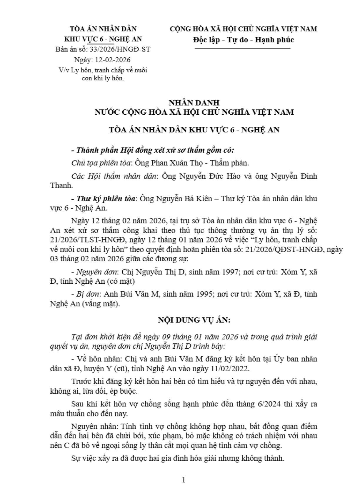 Bản án số 33/2026/HNGĐ-ST ngày 12/02/2026 của Tòa án nhân dân khu vực 6 - Nghệ An, tỉnh Nghệ An về vụ án ly hôn về mâu thuẫn gia đình
