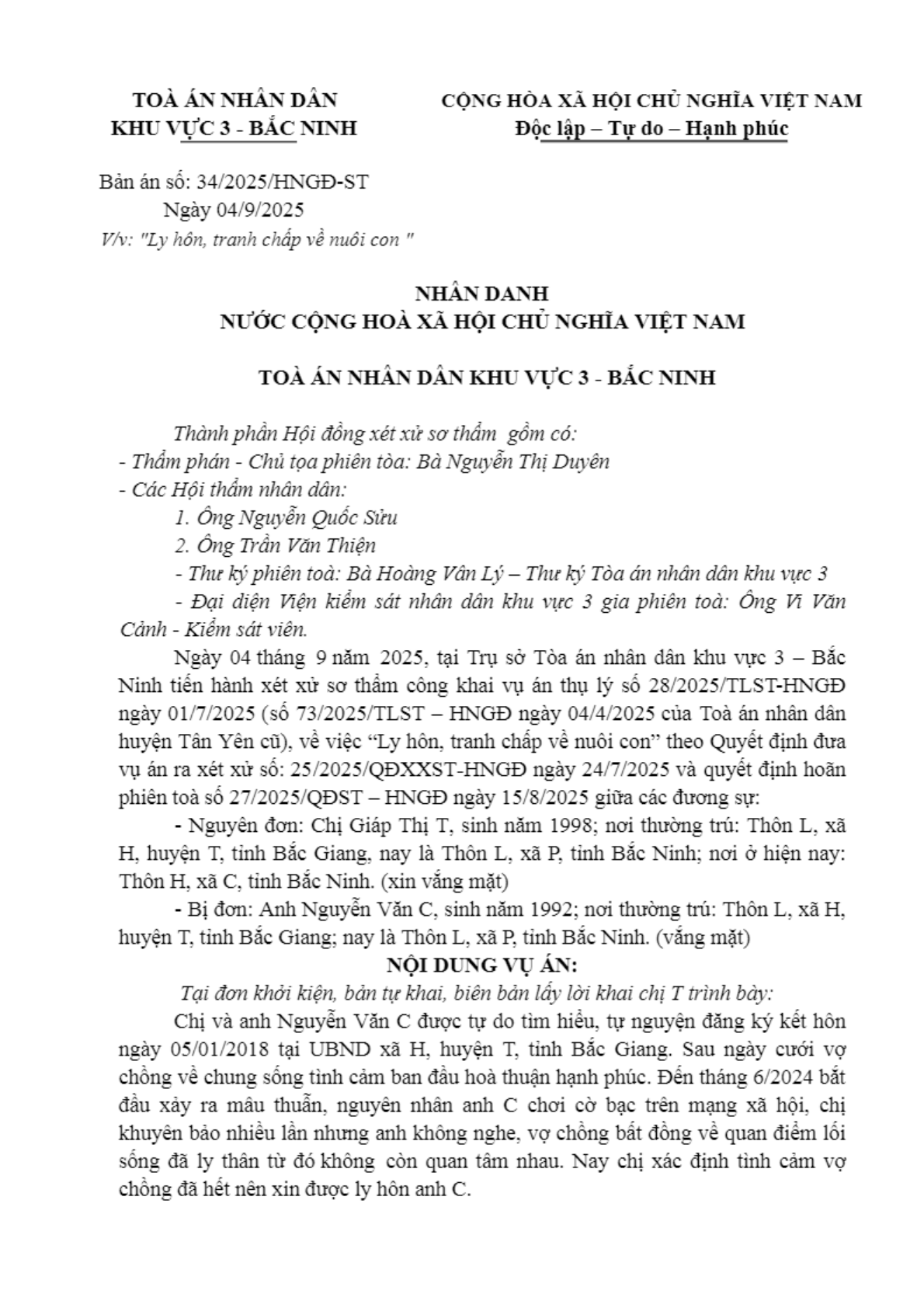 Bản án số 34/2025/HNGĐ-ST ngày 04/09/2025 của Tòa án nhân dân khu vực 3 - Bắc Ninh, tỉnh Bắc Ninh về vụ án ly hôn về mâu thuẫn gia đình