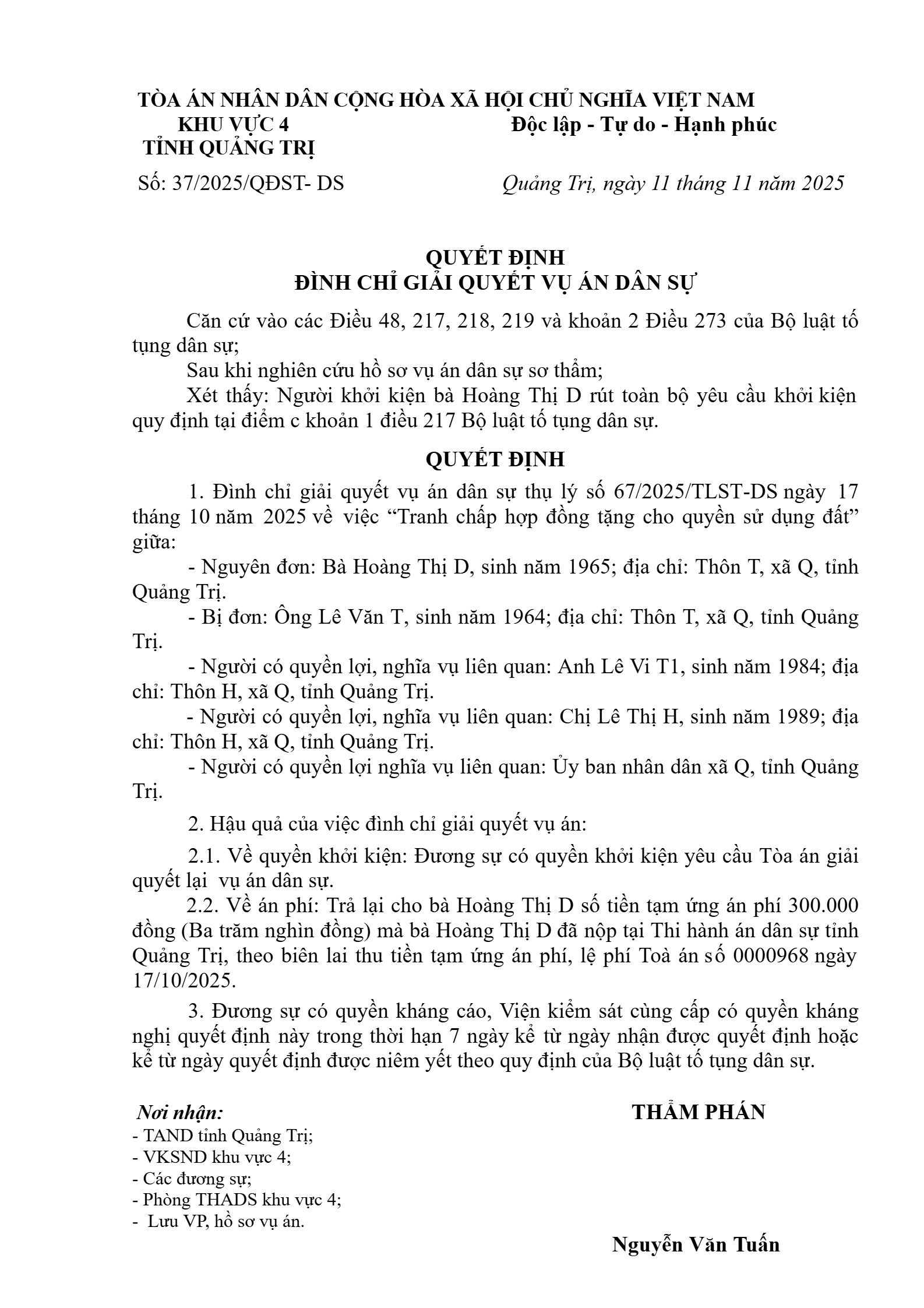 Bản án số 37/2025/DS-ST ngày 11/11/2025 của Tòa án nhân dân khu vực 4 - Quảng Trị, tỉnh Quảng Trị về tranh chấp hợp đồng tặng cho tài sản