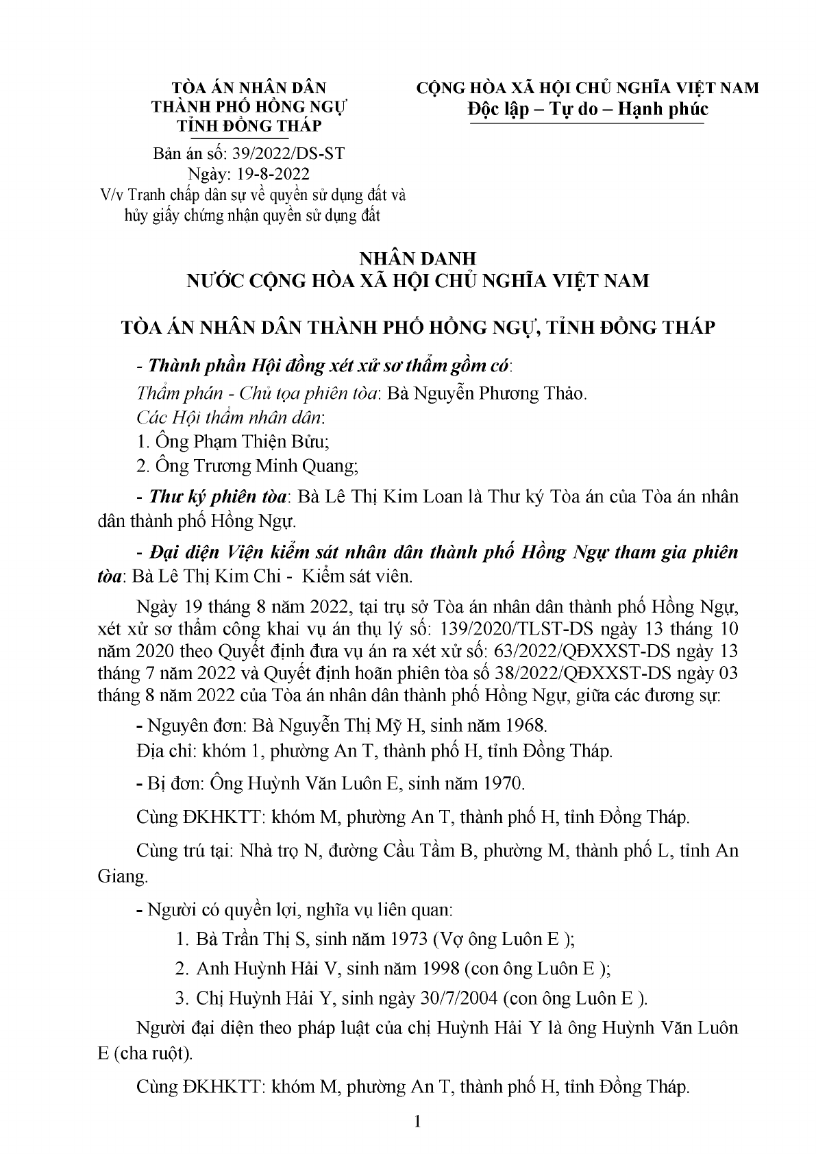 | Tên Bản án: | Bản án số 39/2022/DS-ST ngày 19/08/2022 của TAND TP. Hồng Ngự, tỉnh Đồng Tháp về tranh chấp dân sự quyền sử dụng đất và hủy giấy chứng nhận quyền sử dụng đất |