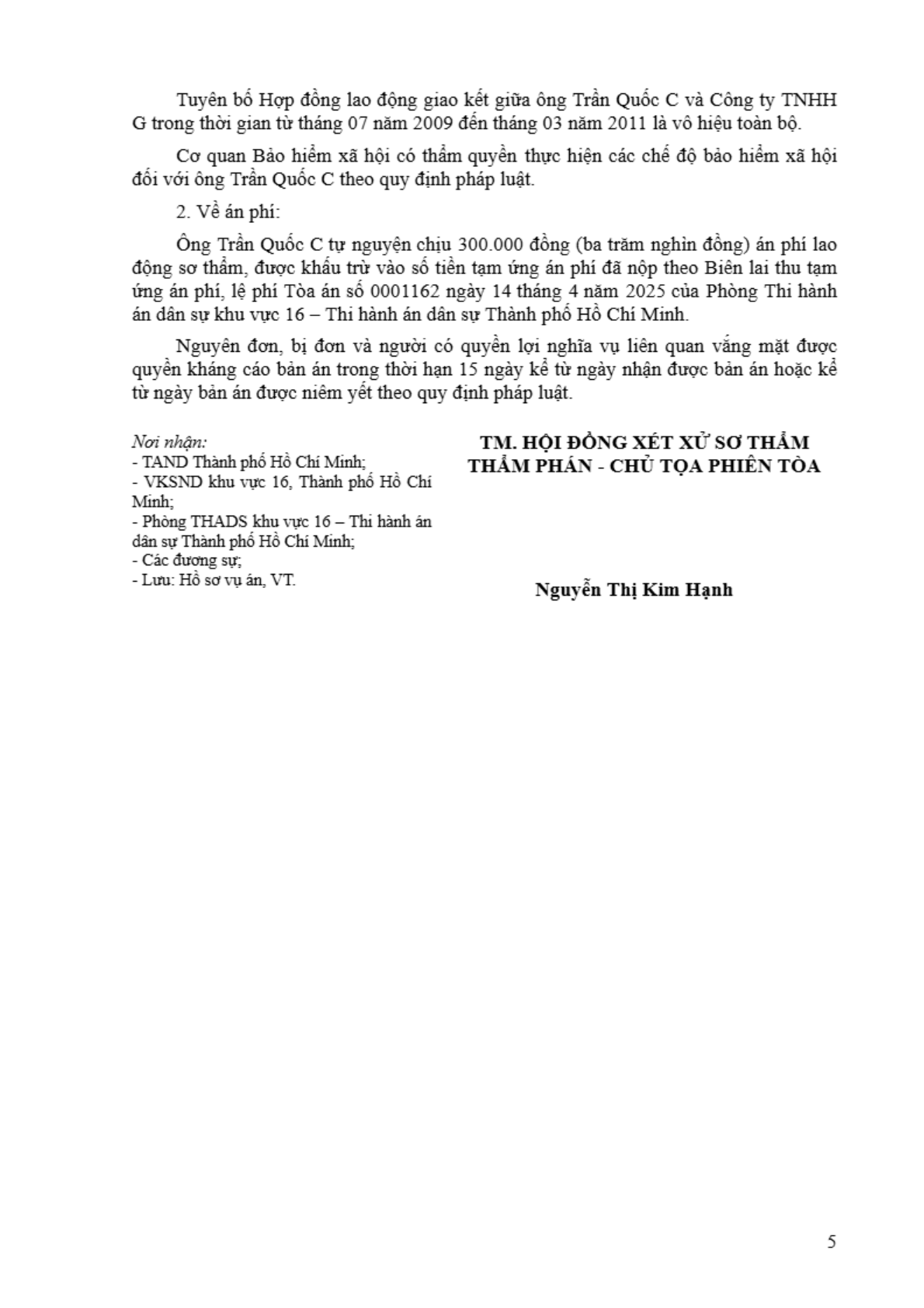Bản án số 43/2025/LĐ-ST ngày 08/08/2025 của Tòa án nhân dân khu vực 16 - Hồ Chí Minh, TP. Hồ Chí Minh về tranh chấp về xử lý kỷ luật, sa thải, đơn phương chấm dứt hợp đồng lao động