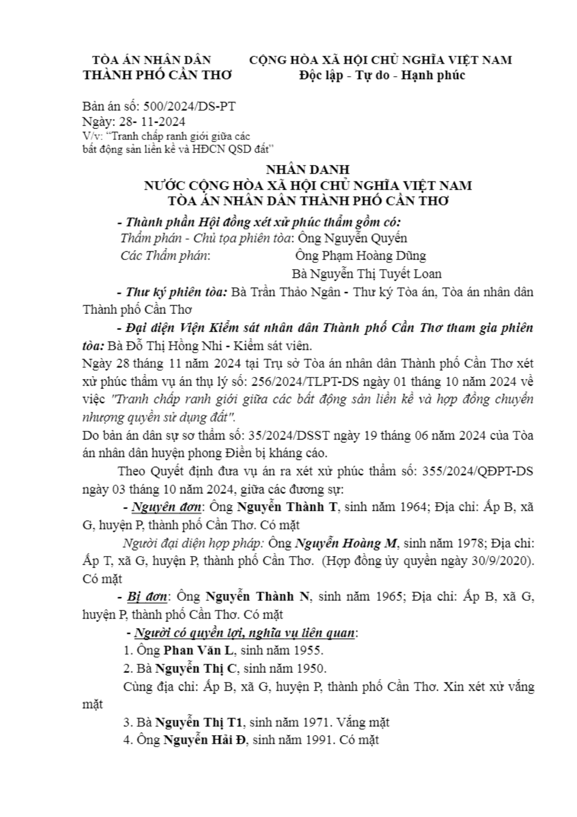 | Tên Bản án: | Bản án số 500/2024/DS-PT ngày 28/11/2024 của TAND TP. Cần Thơ về tranh chấp đất đai |