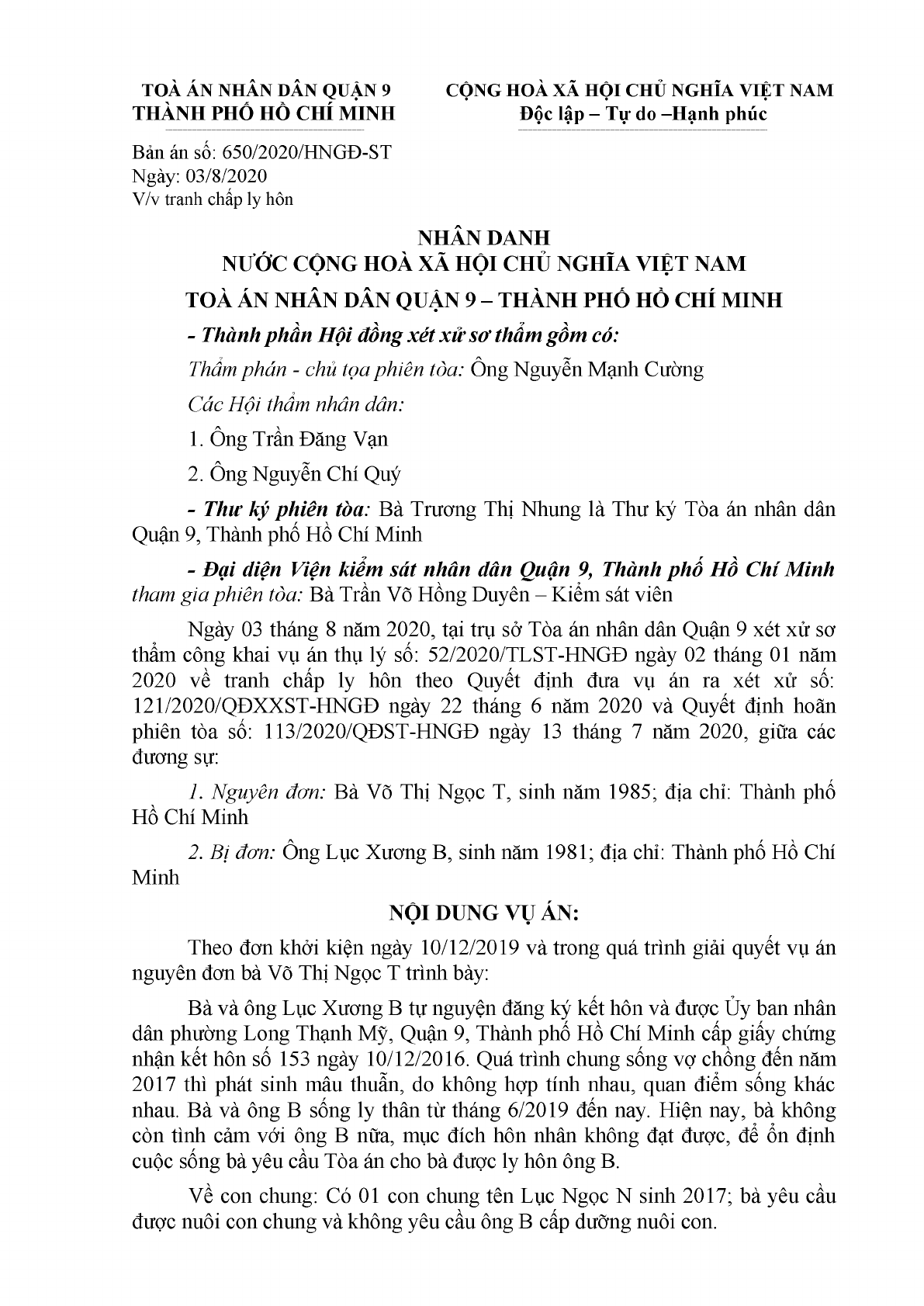 | Tên Bản án: | Bản án số 650/2020/HNGĐ-ST ngày 03/08/2020 của TAND Quận 9, TP. Hồ Chí Minh về tranh chấp ly hôn |