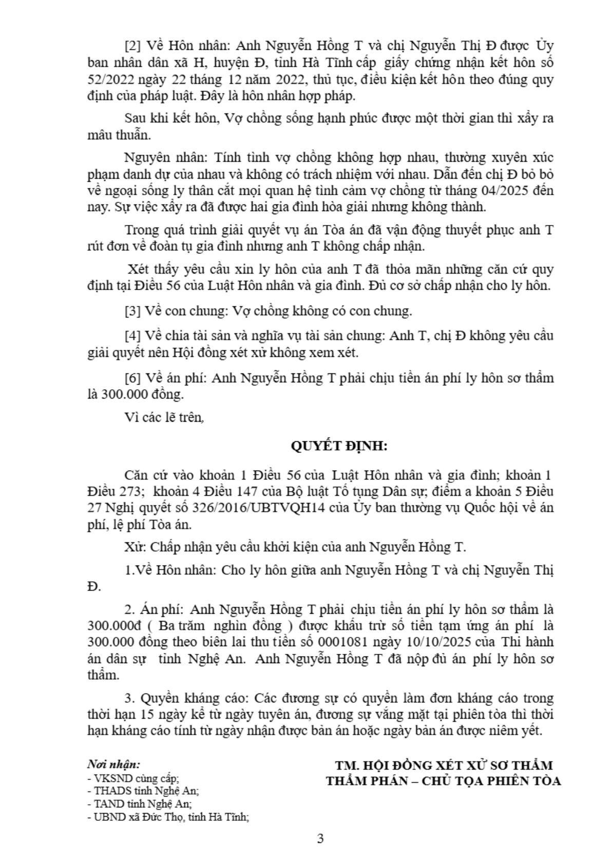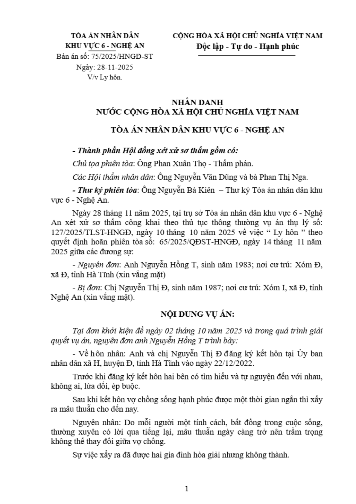 Bản án số 75/2025/HNGĐ-ST ngày 28/11/2025 của Tòa án nhân dân khu vực 6 - Nghệ An, tỉnh Nghệ An về vụ án ly hôn về mâu thuẫn gia đình